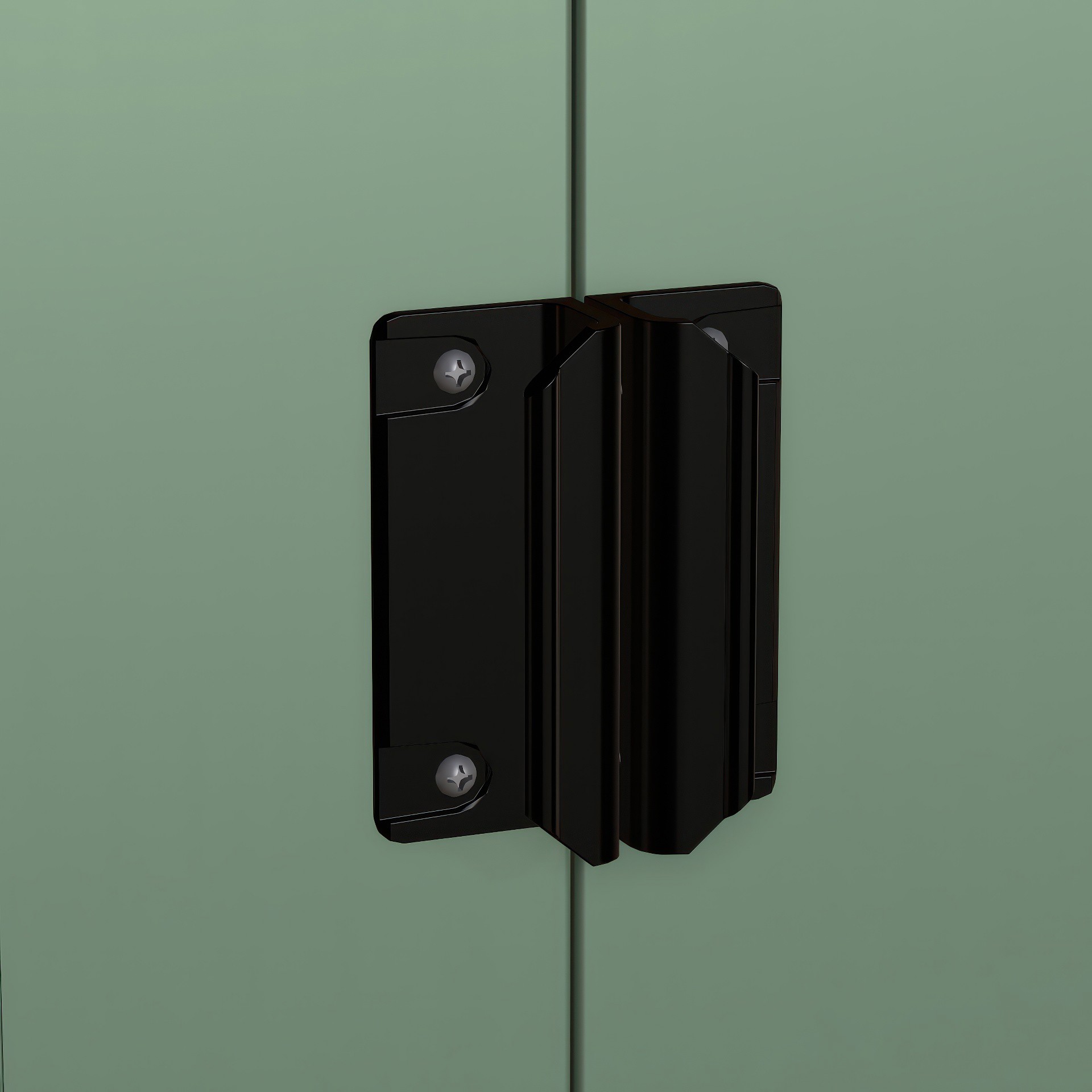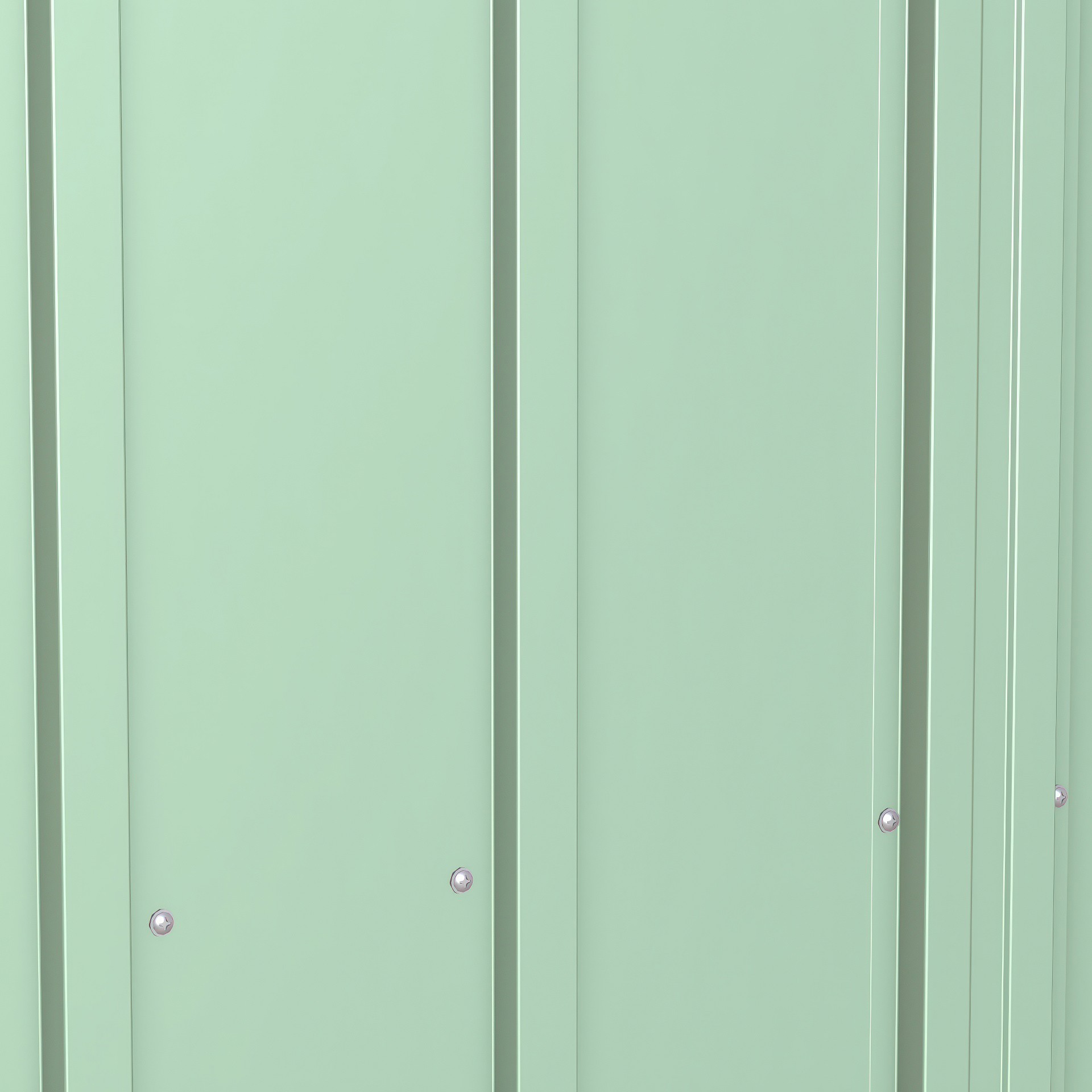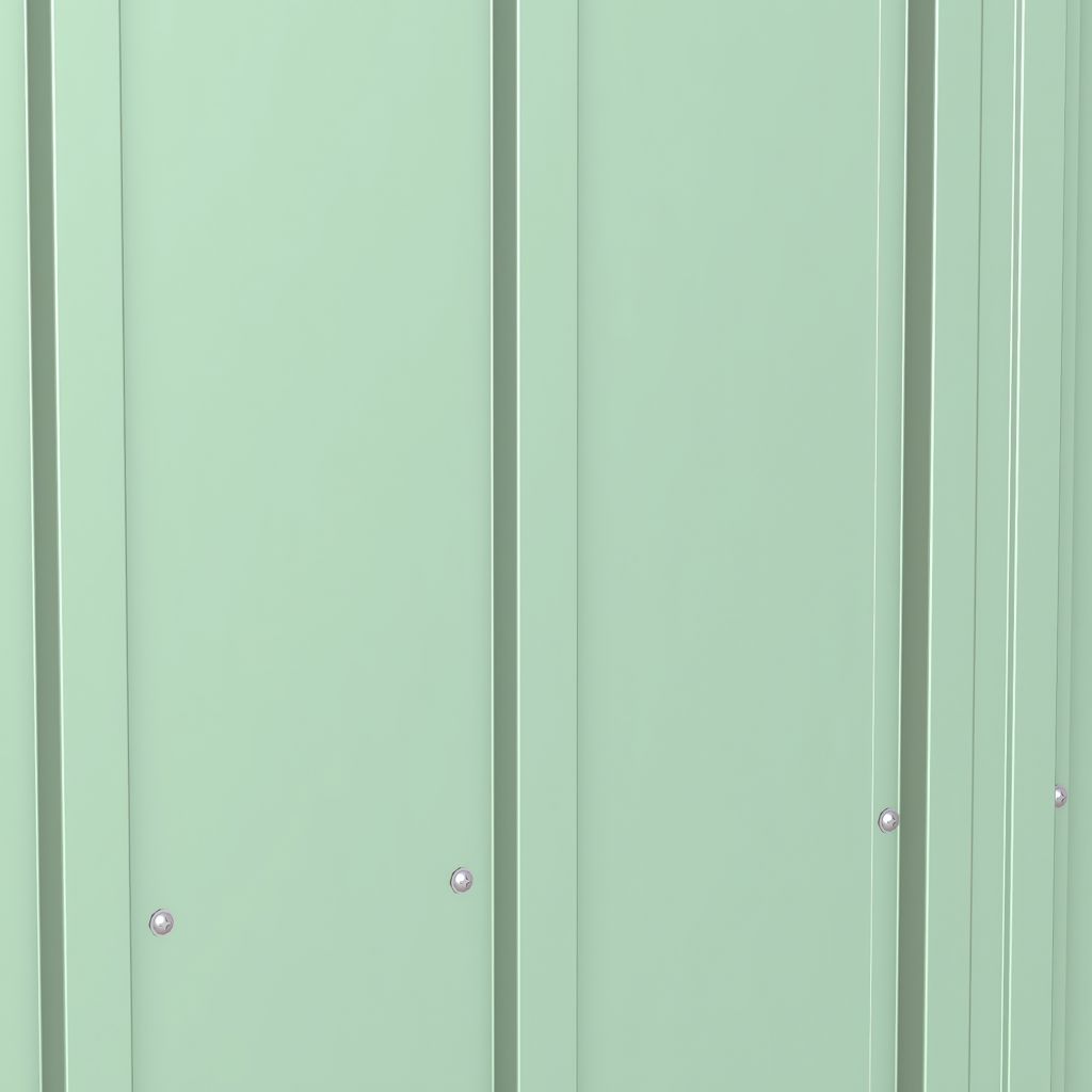 The shed is made of galvanized steel treated to prevent rust and corrosion. Its low gable roof is designed to prevent water from accumulating.