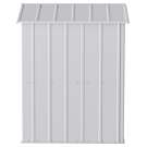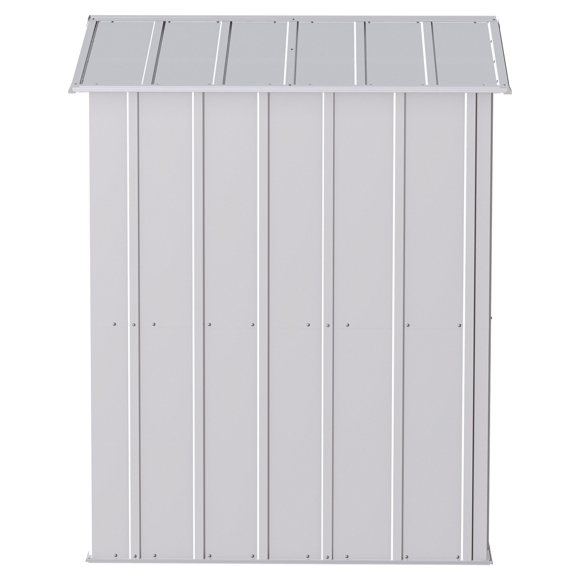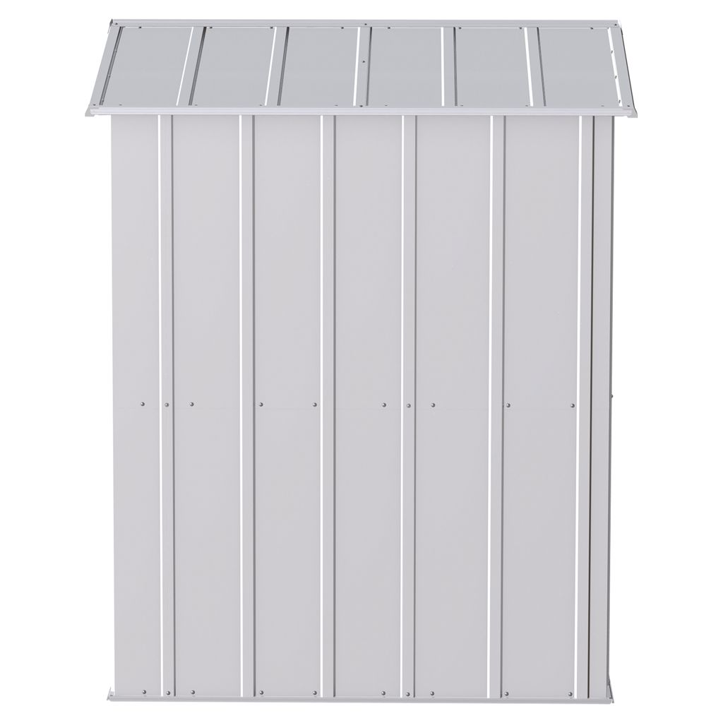 The shed is made of galvanized steel treated to prevent rust and corrosion. Its low gable roof is designed to prevent water from accumulating.