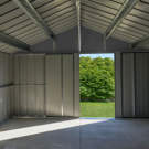 The shed's timeless vertical wall panels are finished with smooth, hard-wearing Sherwin-Williams Paint finish protects against the elements and seals the steel against rust and corrosion.