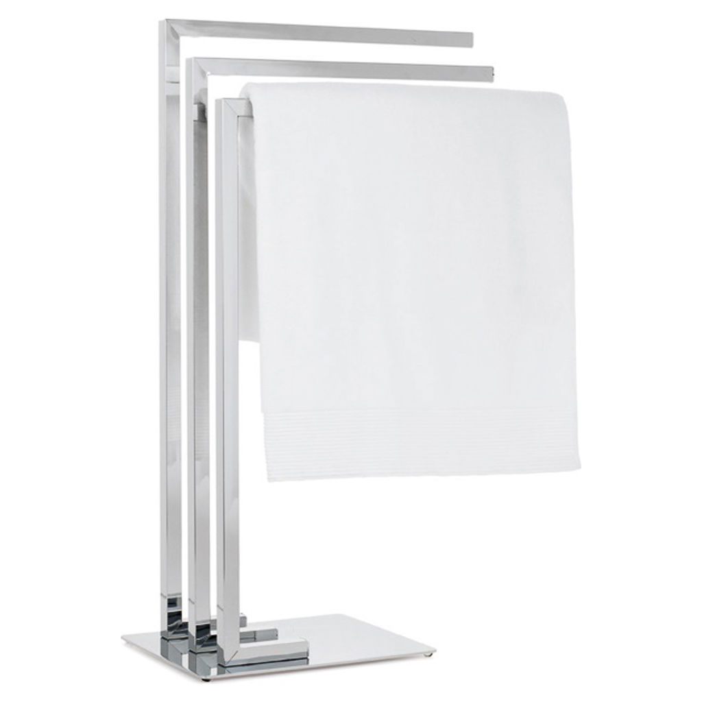 Add extra storage to your bathroom with this cleverly designed pedestal towel rack. Featuring clean lines, the polished chrome rack features a flat base and three offset rods for towels or linens.