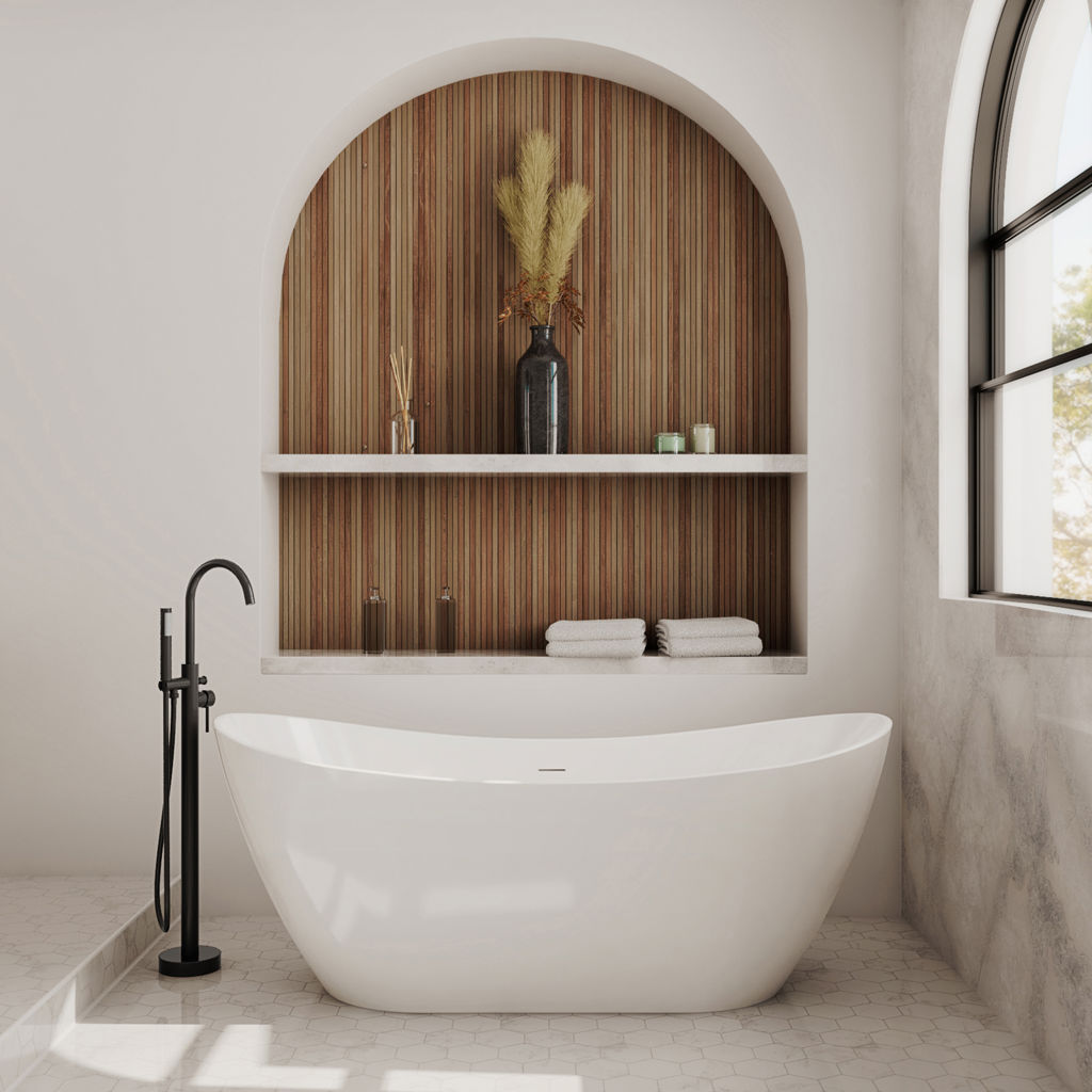 Designed with both durability and style in mind, the Mahaba bathtub and Linosa floor-mounted faucet complete your ideal bathroom renovation project.