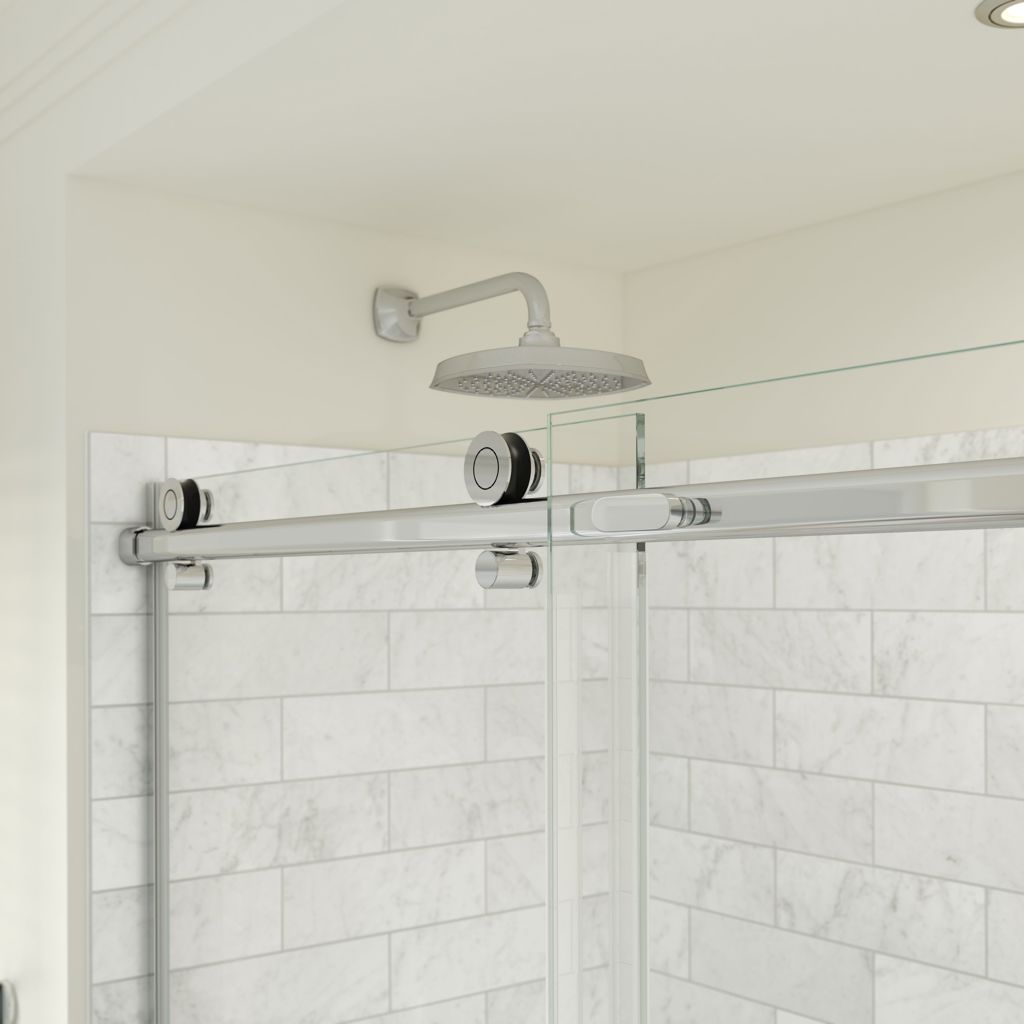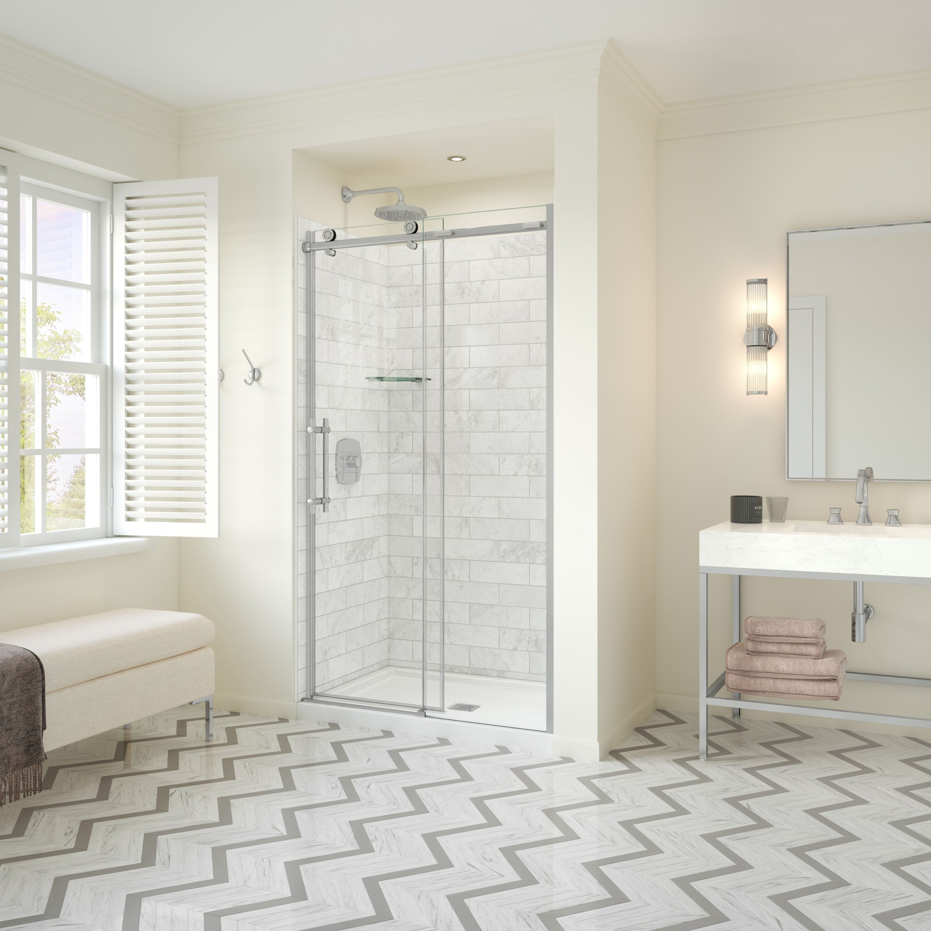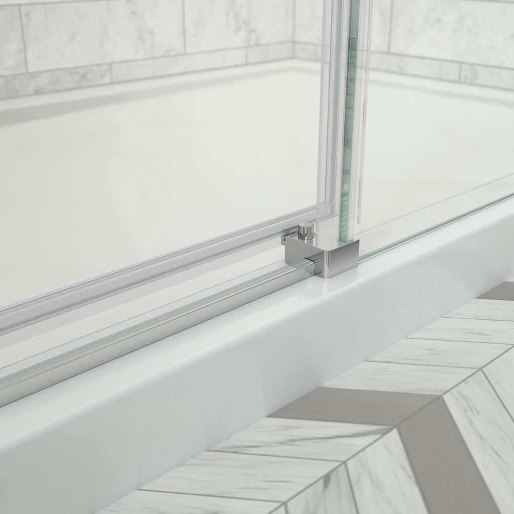 Available in 60-inch and 48-inch shower doors, either for an alcove by itself, or for a corner installation with a return panel.