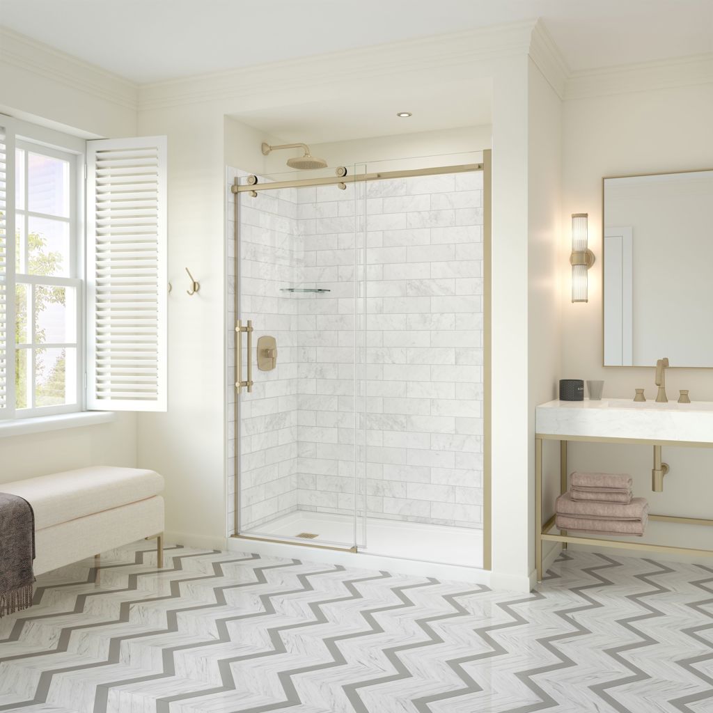 The Odyssey shower door gives a modern and refined look to any bathroom with its fluid movement and elegant finishes such as brushed gold, chrome, brushed nickel and matte black.