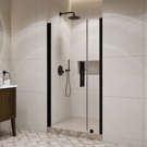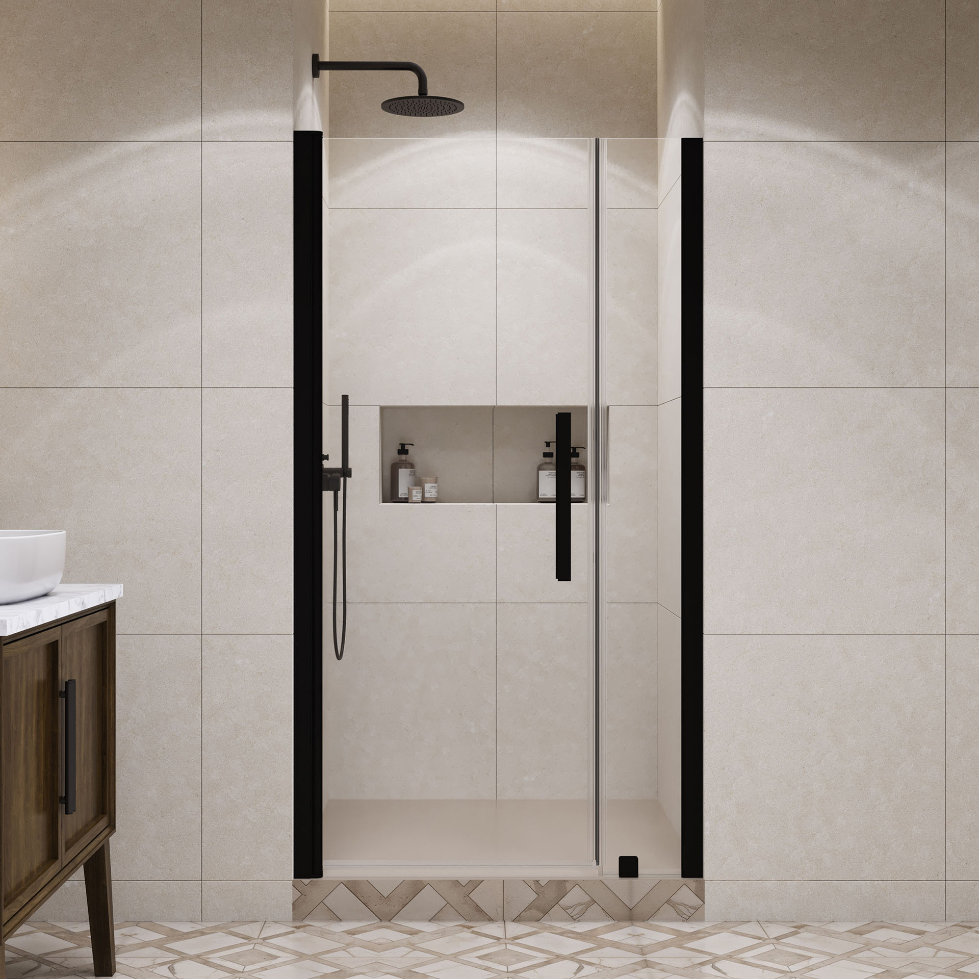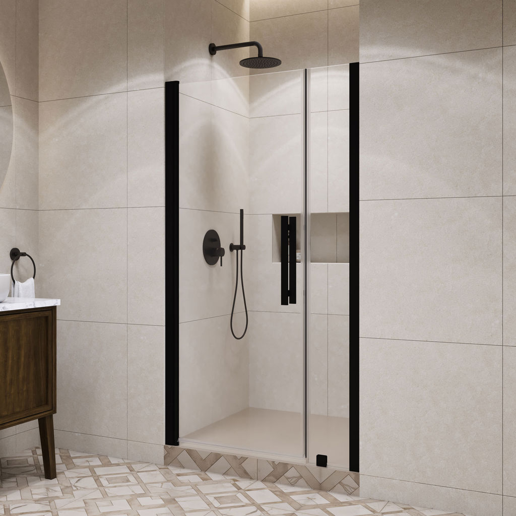 It features a full-length wall-to-door pivot mechanism, premium black hardware, and includes a 29 in. glass door panel and an 8 in. inline fixed panel, ideal for alcove installation.