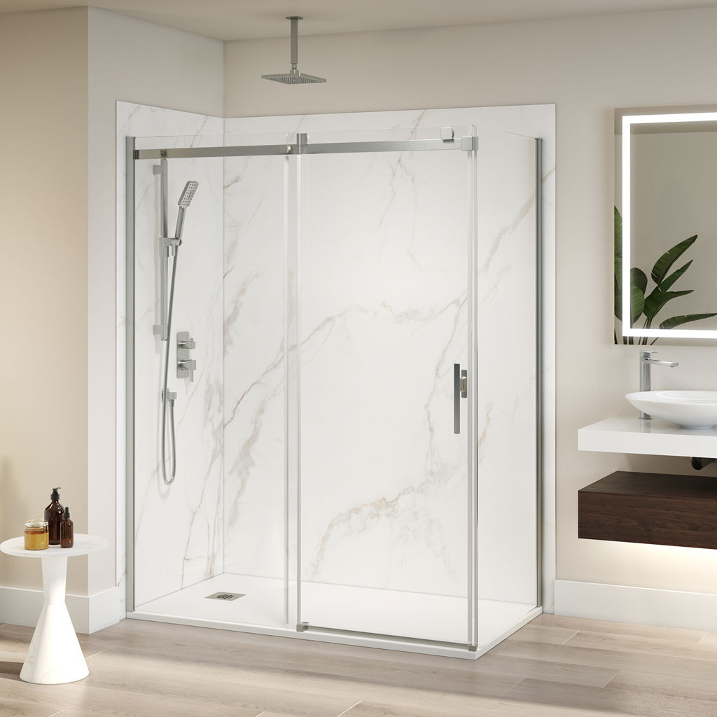 In addition to matching perfectly with the doors and bases of Kalia, Kalia shower wall panels are effortlessly stylish and come in a choice of contemporary and timeless looks including: classic ceramic tile, ultra-modern industrial, and contemporary-chic marble.
