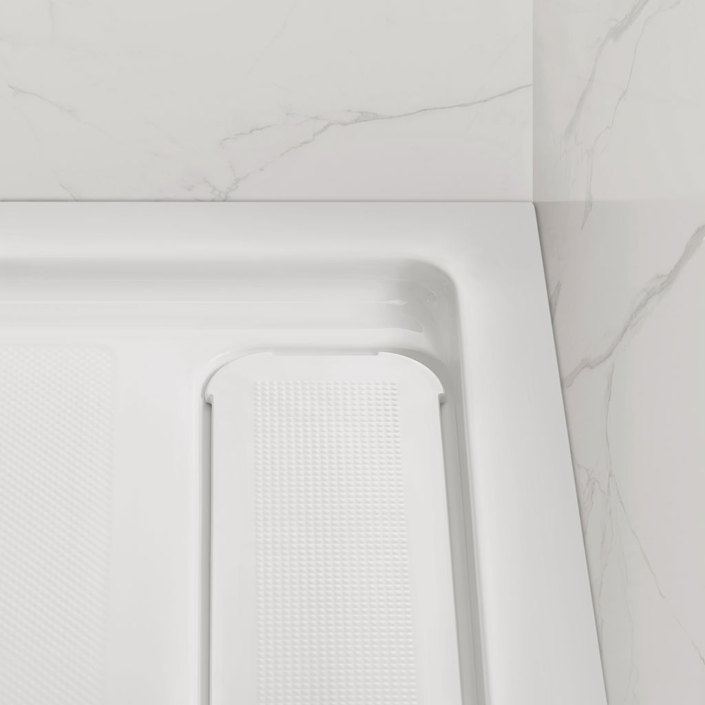 Removable flanges make this low-threshold base compatible with both corner and alcove installations.