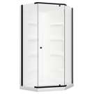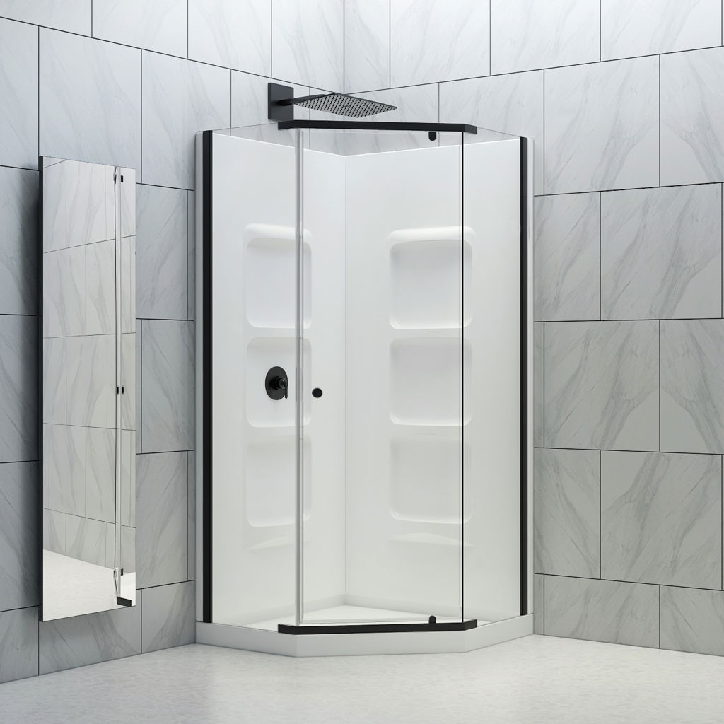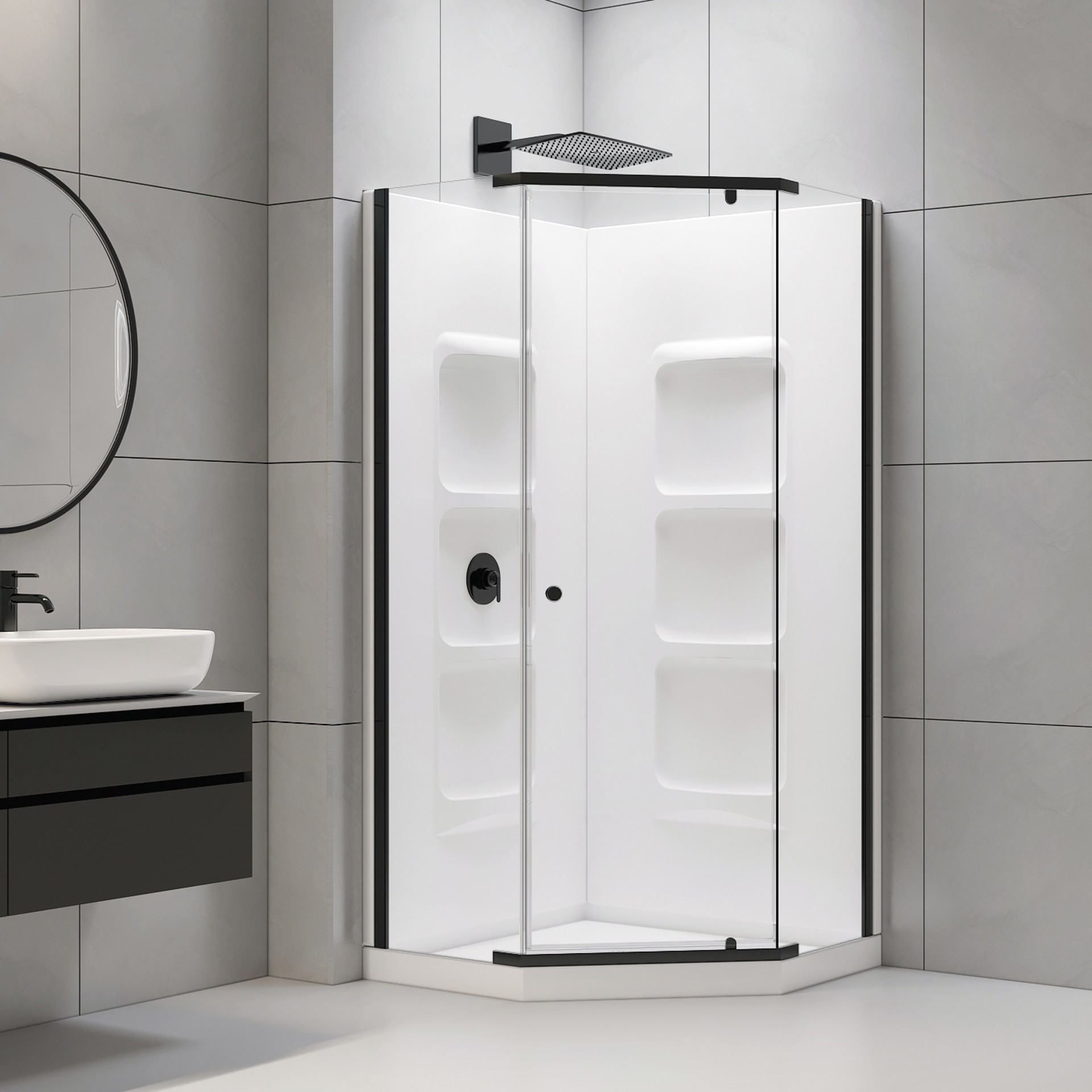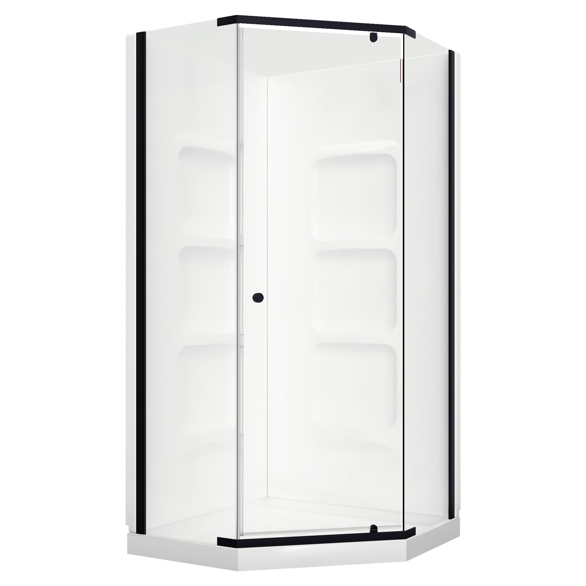 Tempered glass panels and an easy-to-clean shower pan form the angular design of the neo-angled shower that fits perfectly in the corner of an en suite or detached bathroom. Recessed shelves offer integrated organization for storing soap, shampoo and shower toiletries within the acrylic shower walls.