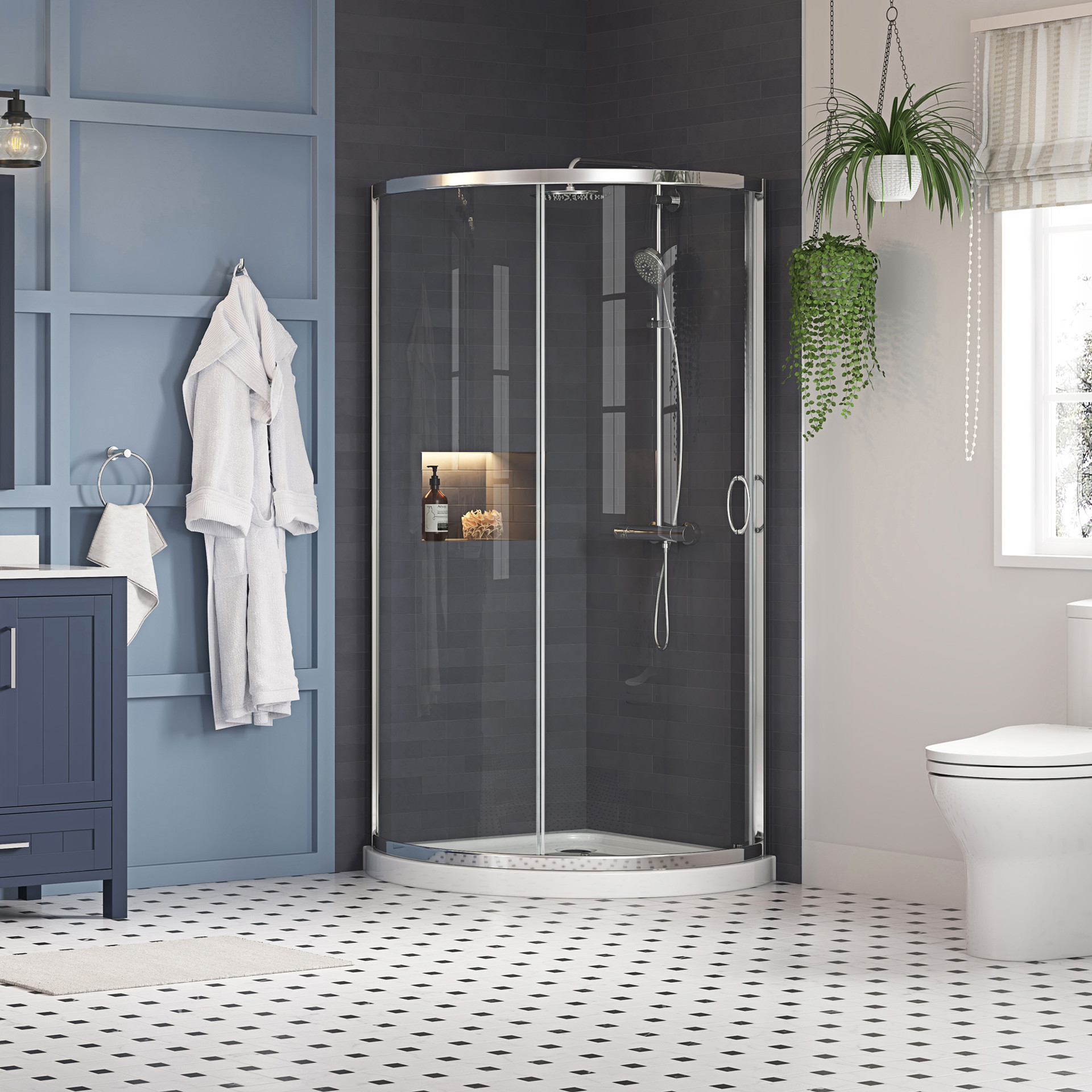 The rounded, framed shower enclosure is perfectly suited for compact and small-sized bathrooms.