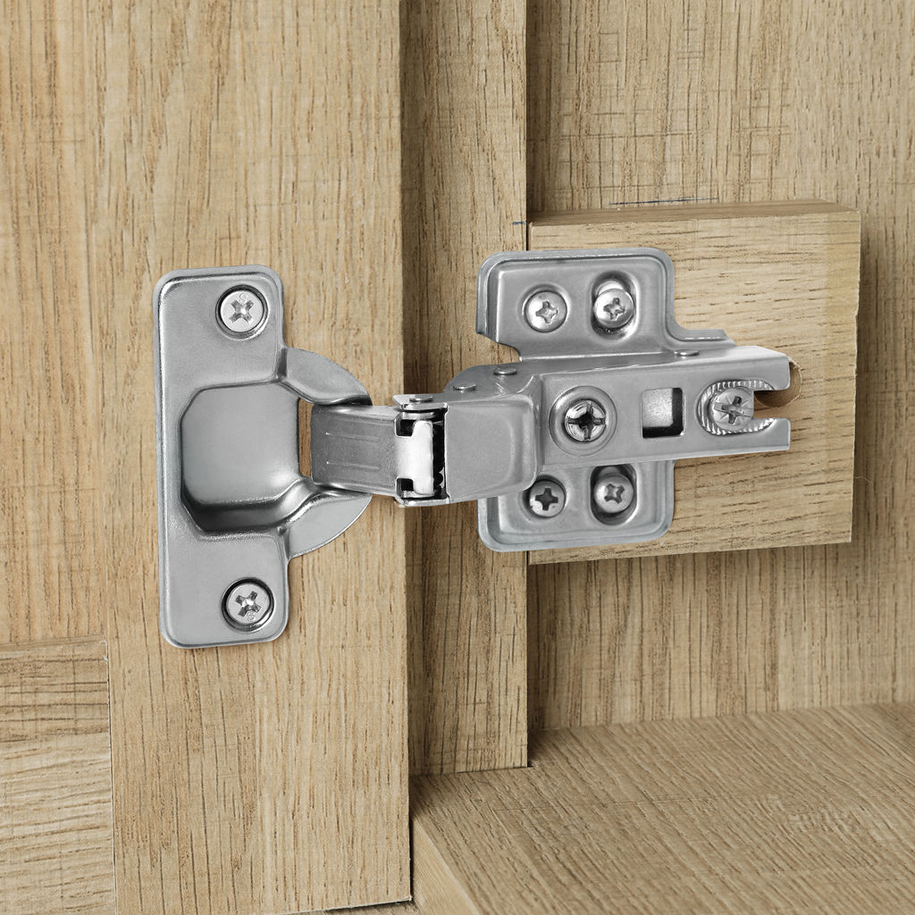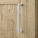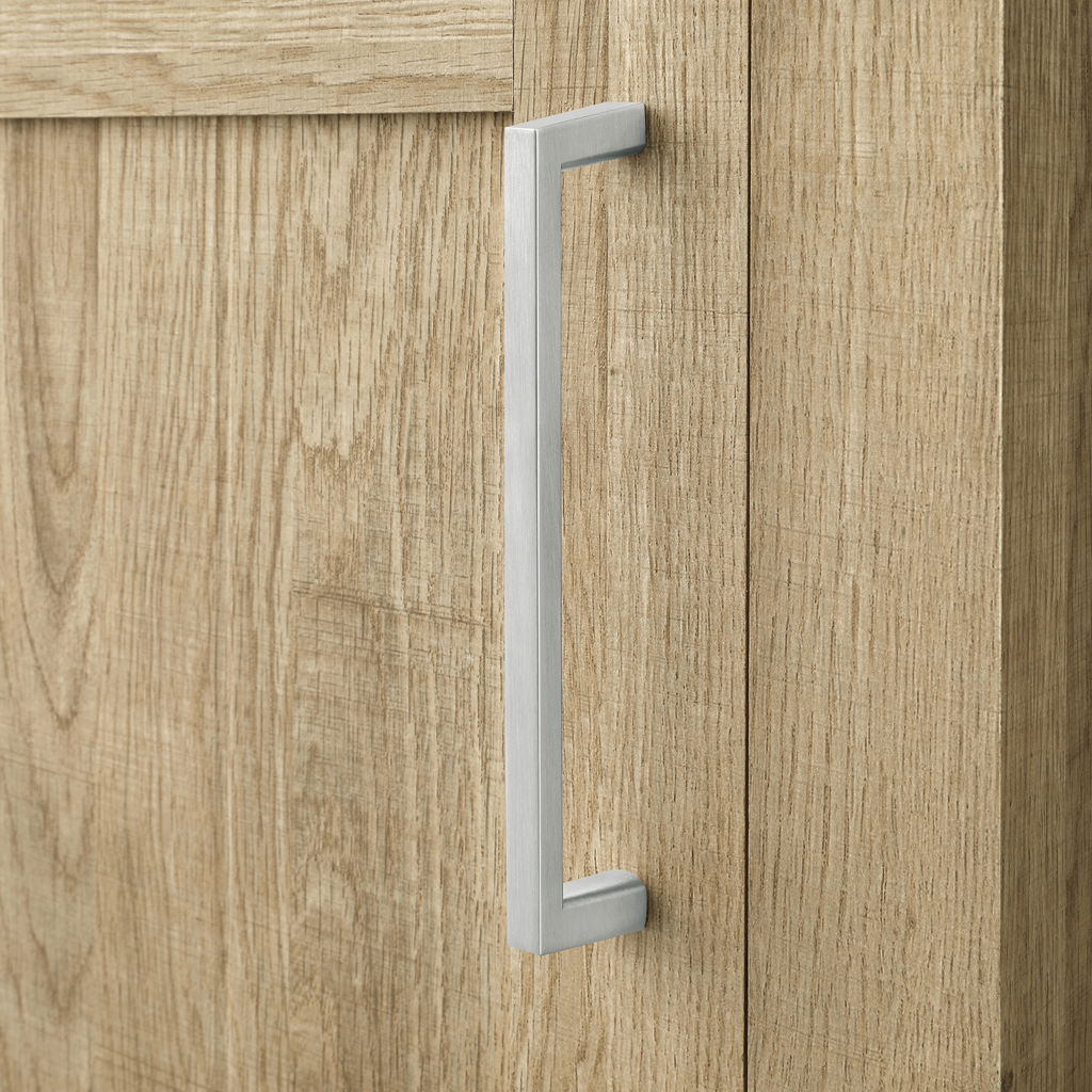 This freestanding unit includes a single-door cabinet with a height-adjustable interior shelf and a bottom drawer, all equipped with soft-close mechanisms.