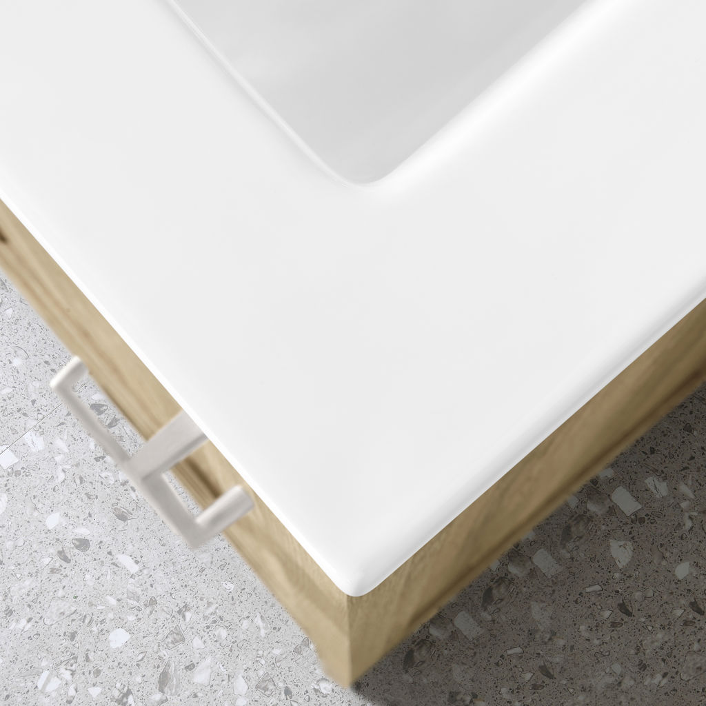 Its one-piece ceramic countertop with an integrated sink maximizes the use of its compact surface area.