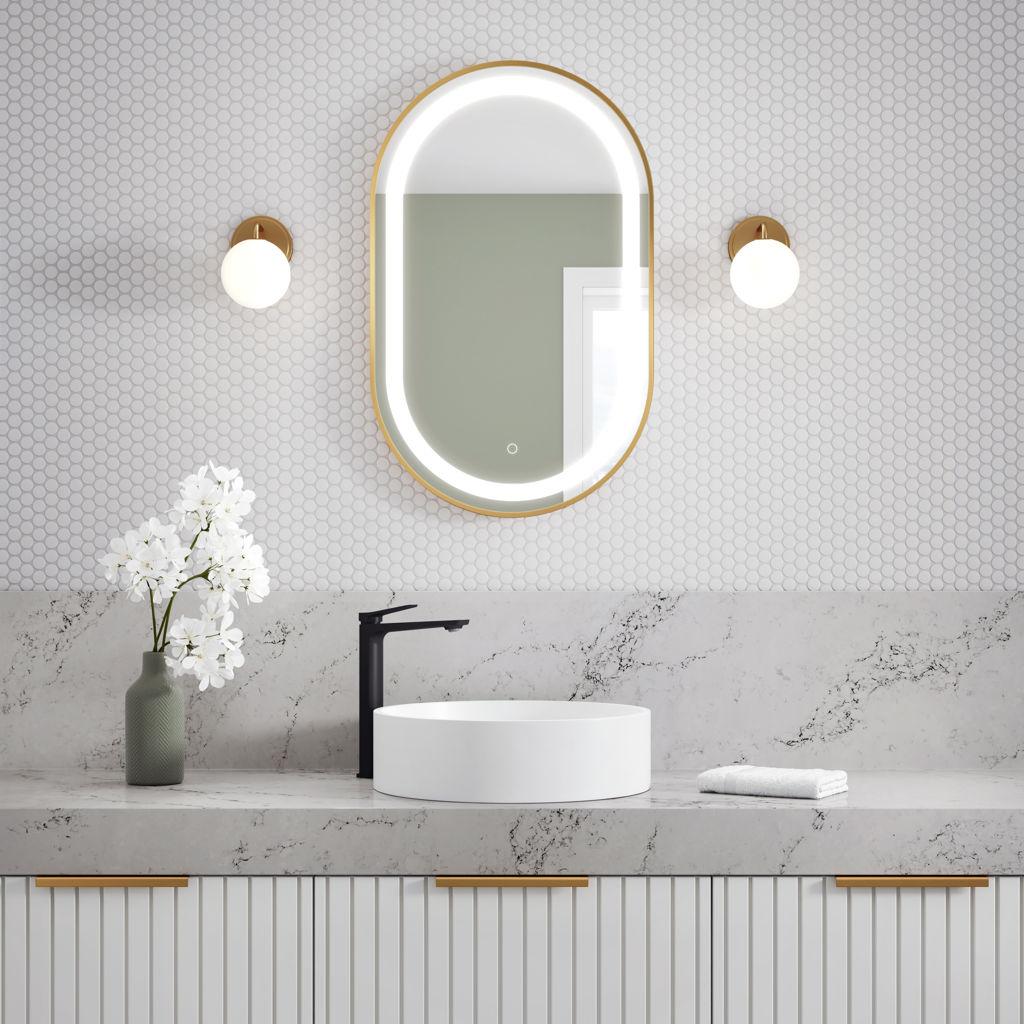 LED Illuminated Oblong Shaped Mirror 20" X 32" Brushed Gold
