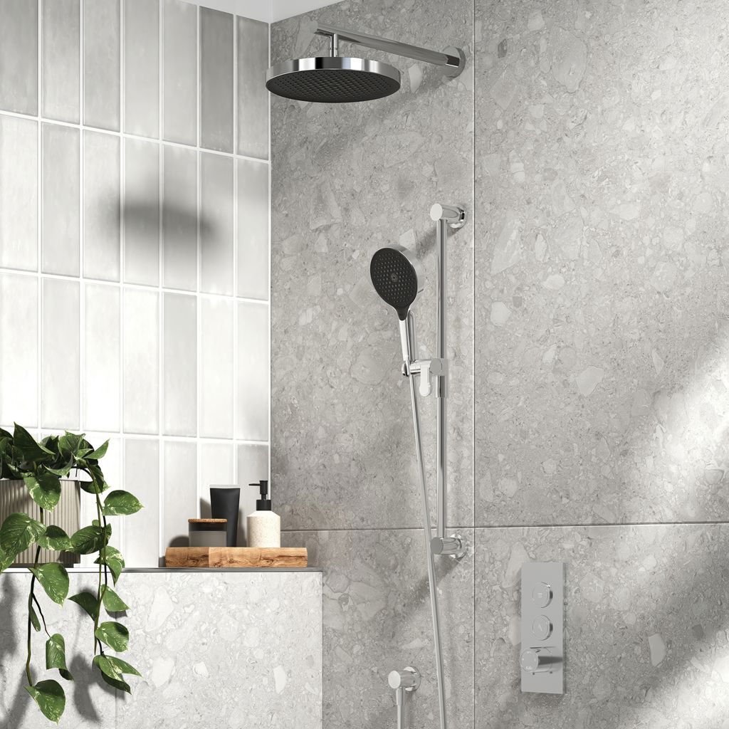 Featuring a temperature control knob and recessed push-buttons, you can easily use 2 or 3 components simultaneously for a personalized shower experience. The European push-button mechanism provides a quality tactile experience that's extremely pleasant and comfortable to use.