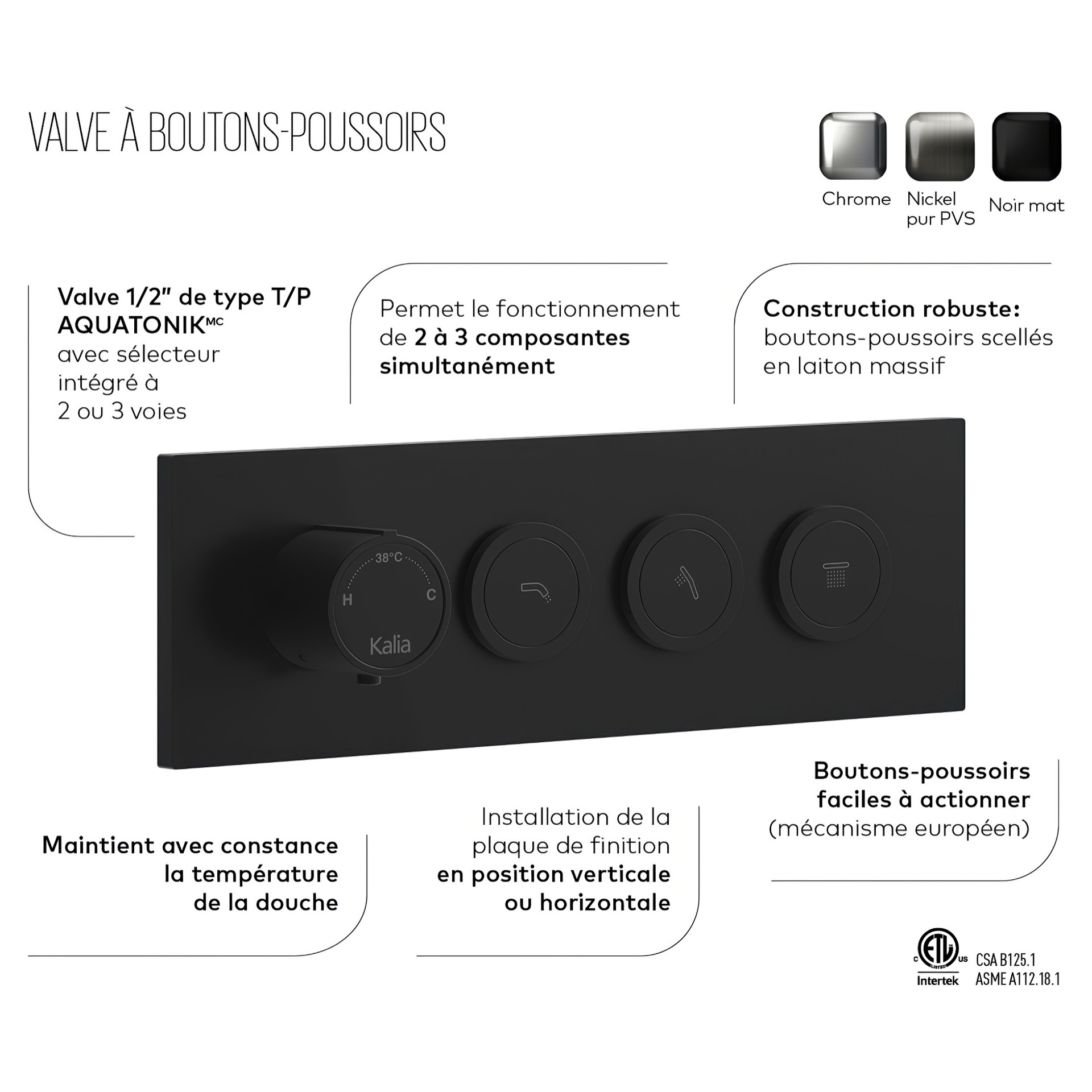 With the temperature control knob and recessed push buttons, you can activate two or three components at a time for a truly personalized shower.