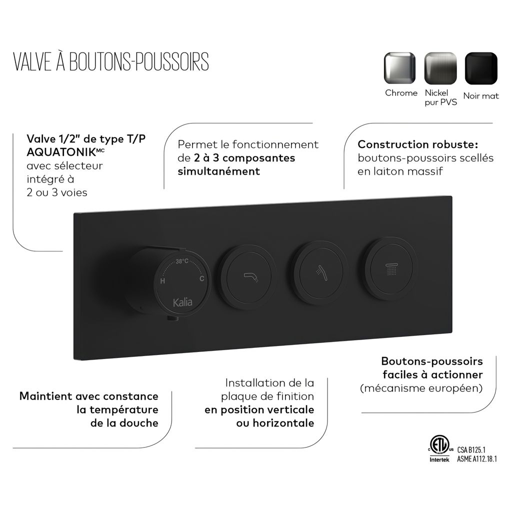 With the temperature control knob and recessed push buttons, you can activate two or three components at a time for a truly personalized shower.