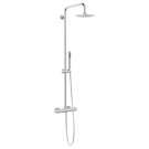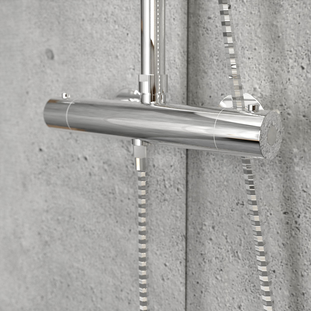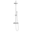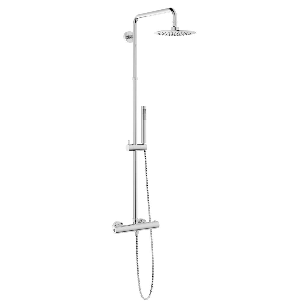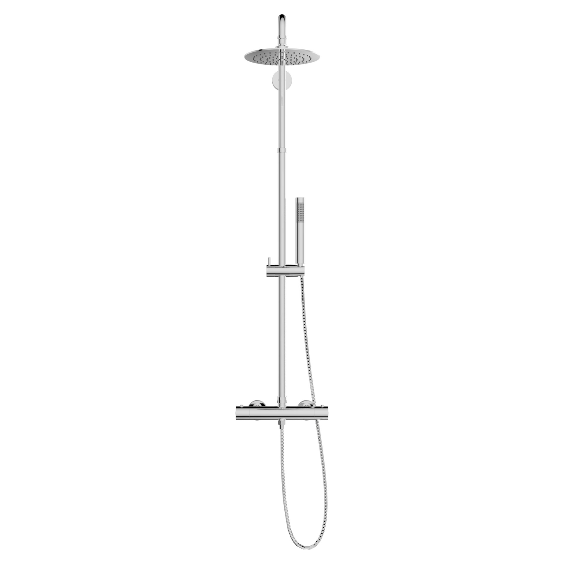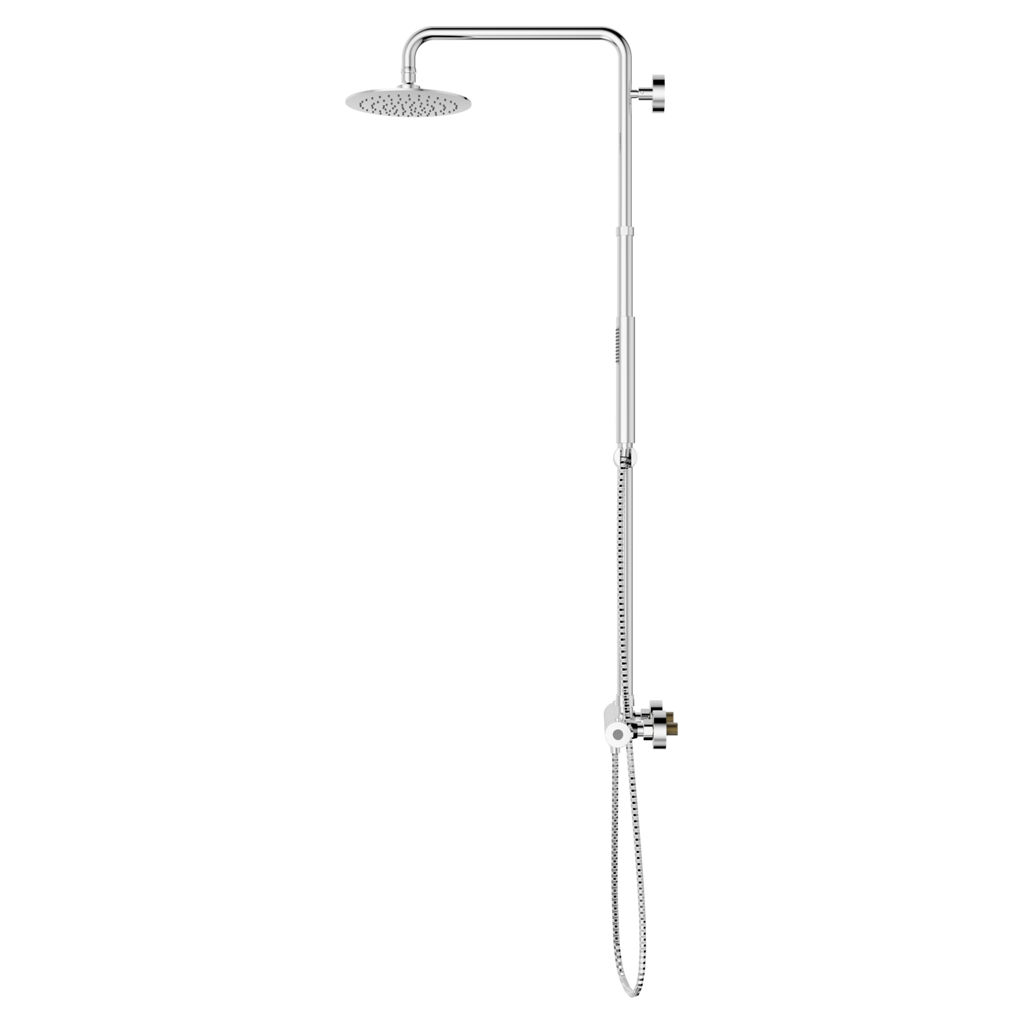 • Complete shower faucet installation with rain shower head and 31" slidebar hand shower, round style.