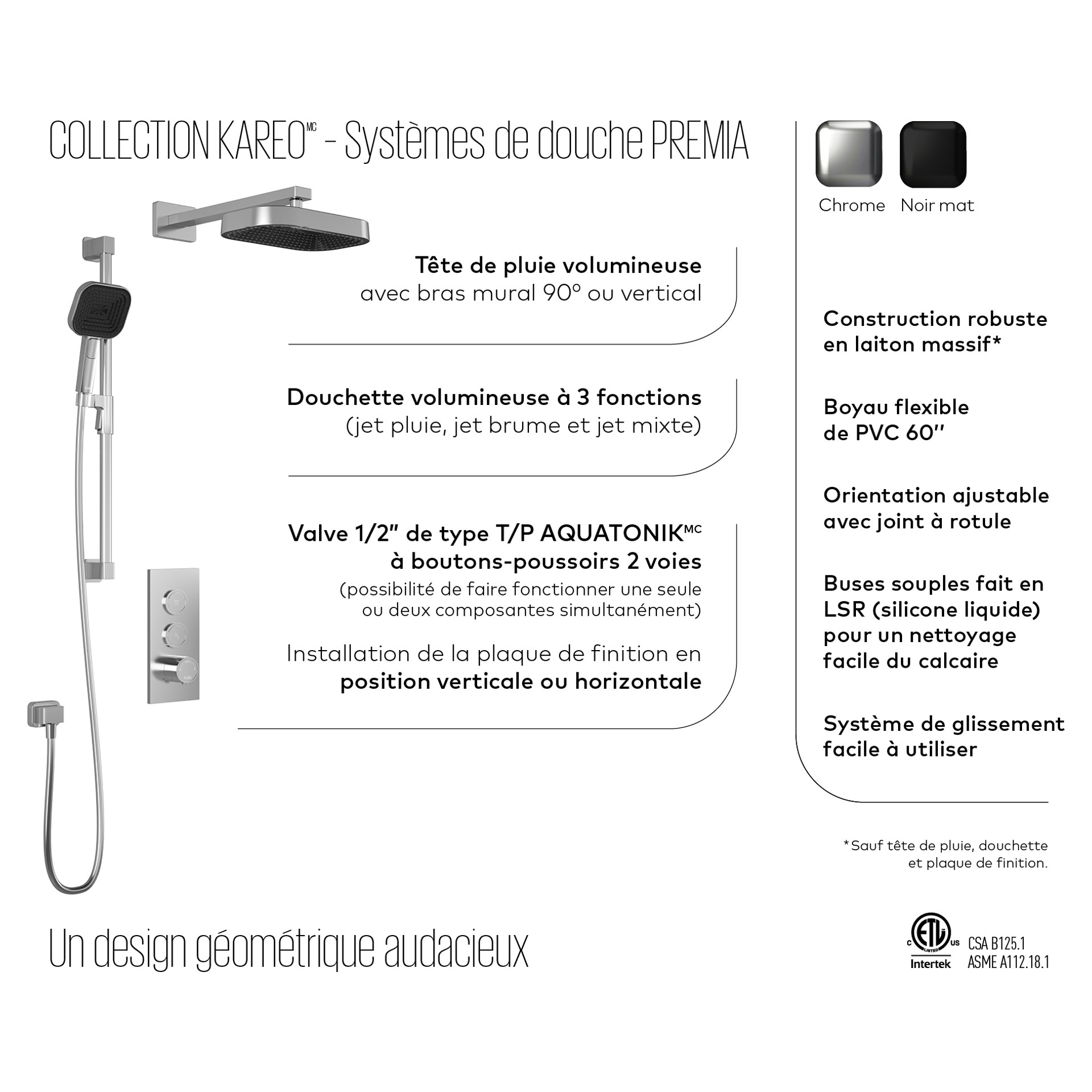 Featuring a temperature control knob and recessed push-buttons, you can easily use 2 or 3 components simultaneously for a personalized shower experience. The European push-button mechanism provides a quality tactile experience that's extremely pleasant and comfortable to use.
