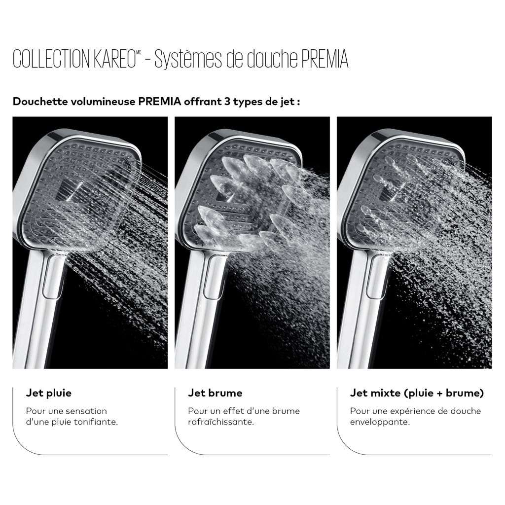 • Generously sized hand shower with 3 functions: mist, rain and mixed (rain + mist)