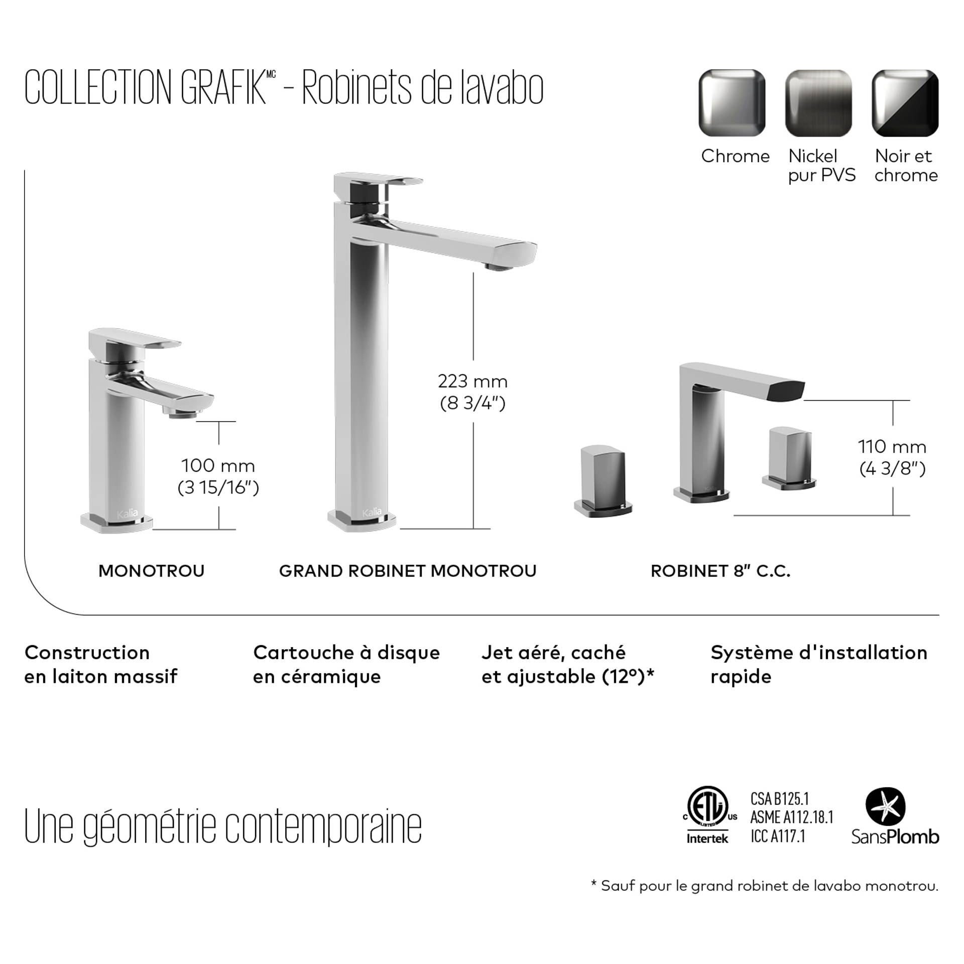 A combination of square and round shapes, the Grafik collection features bold lines that soar above the sink or bathtub. This collection has a style that will charm you for years to come.