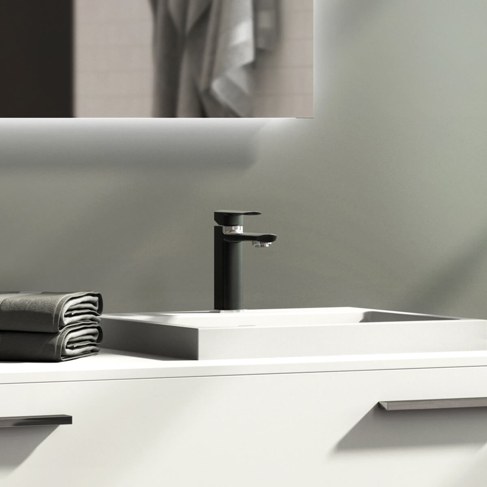 A combination of square and round shapes, the Grafik collection features bold lines that soar above the sink or bathtub. This collection has a style that will charm you for years to come.