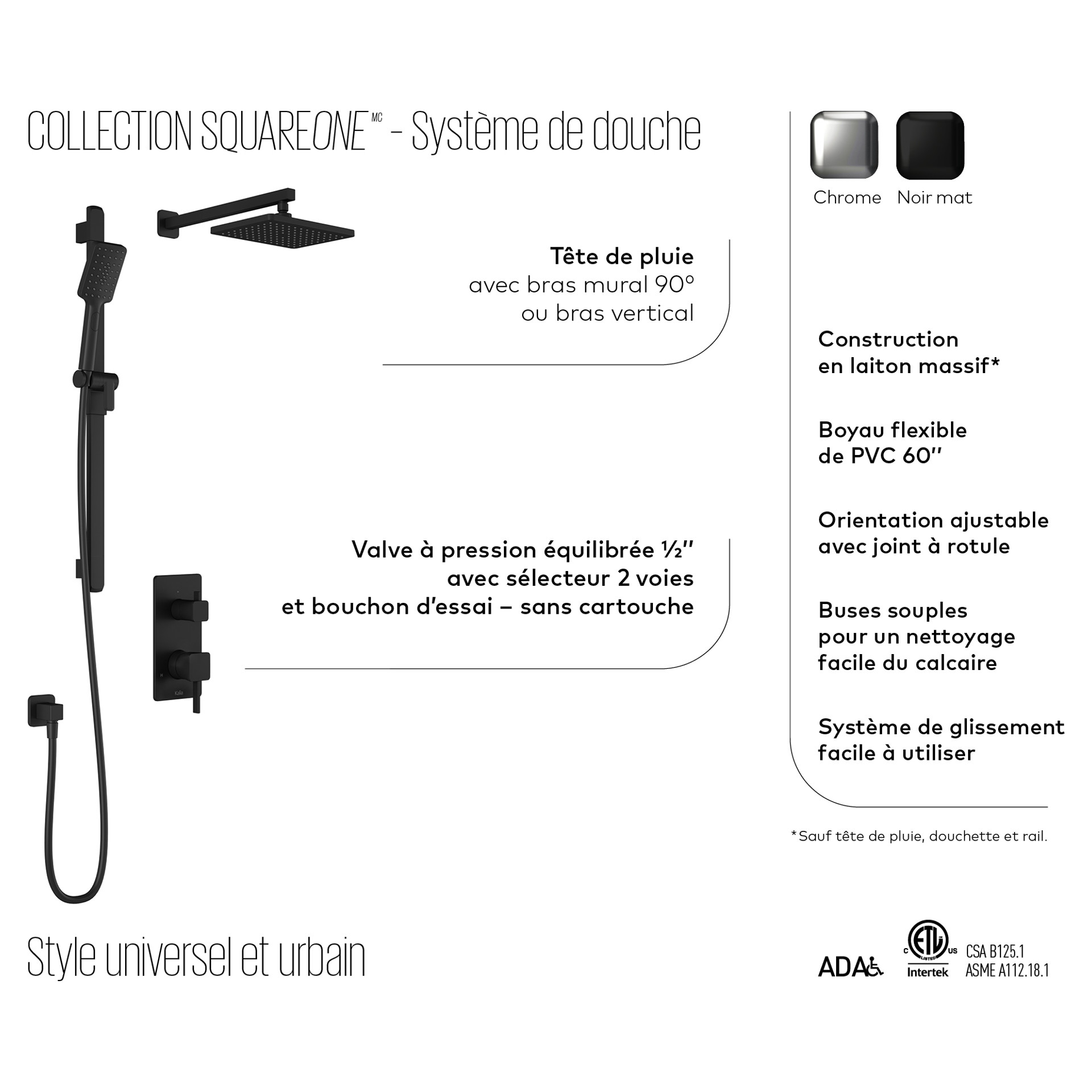 Squareone PB4 Pressure-balanced Shower System with 2-way Selector and Vertical Arm - Chrome Kalia BF2179-110-001