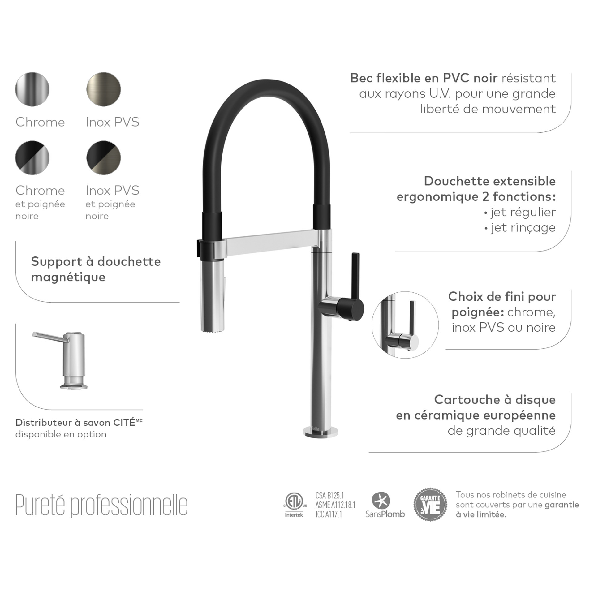 Exki single-control kitchen faucet with black PVC spout - PVS stainless steel and black handle Kalia KF1751-170