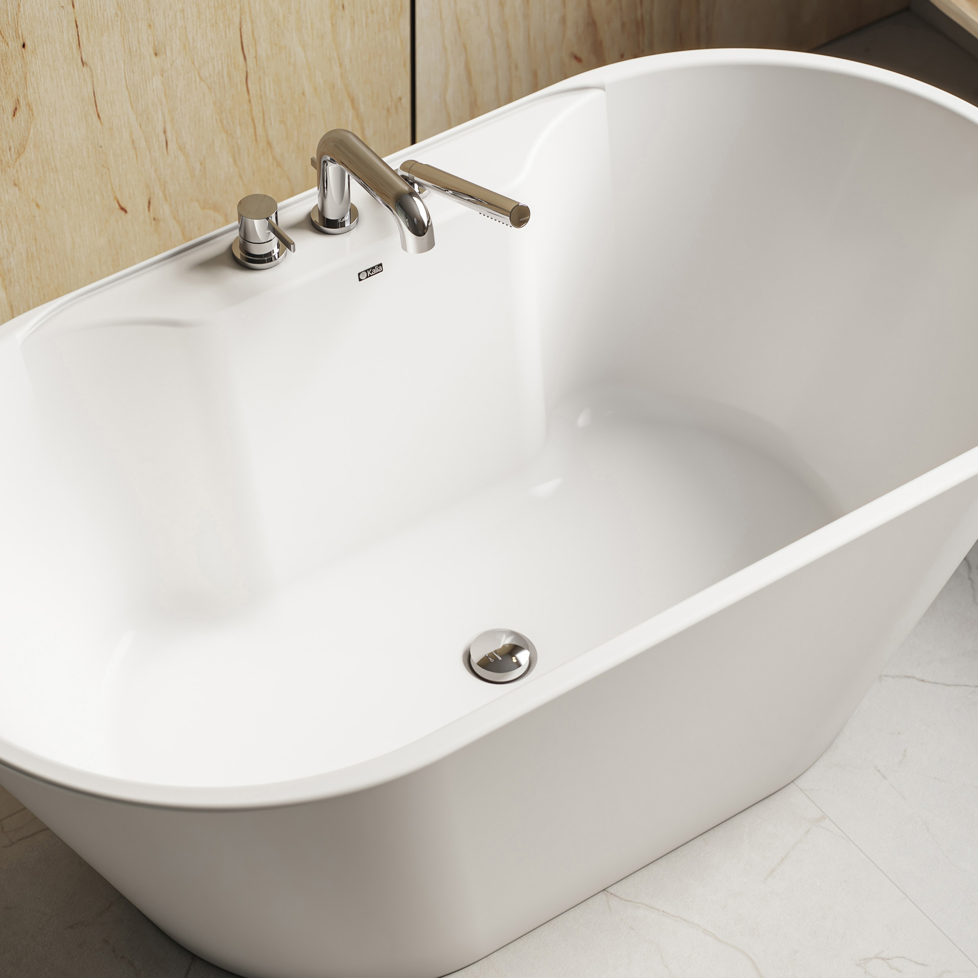 Indulge in the ultimate relaxation with the Kalma freestanding bathtub from Kalia. Crafted from a seamless, one-piece acrylic design, it impresses with its generous curves (1497 × 788 × 580 mm), minimal structure, and flawless finish. Its raised bottom allows the drain to be installed directly above the floor for easy setup, whether you choose an island placement or wall-adjacent installation.