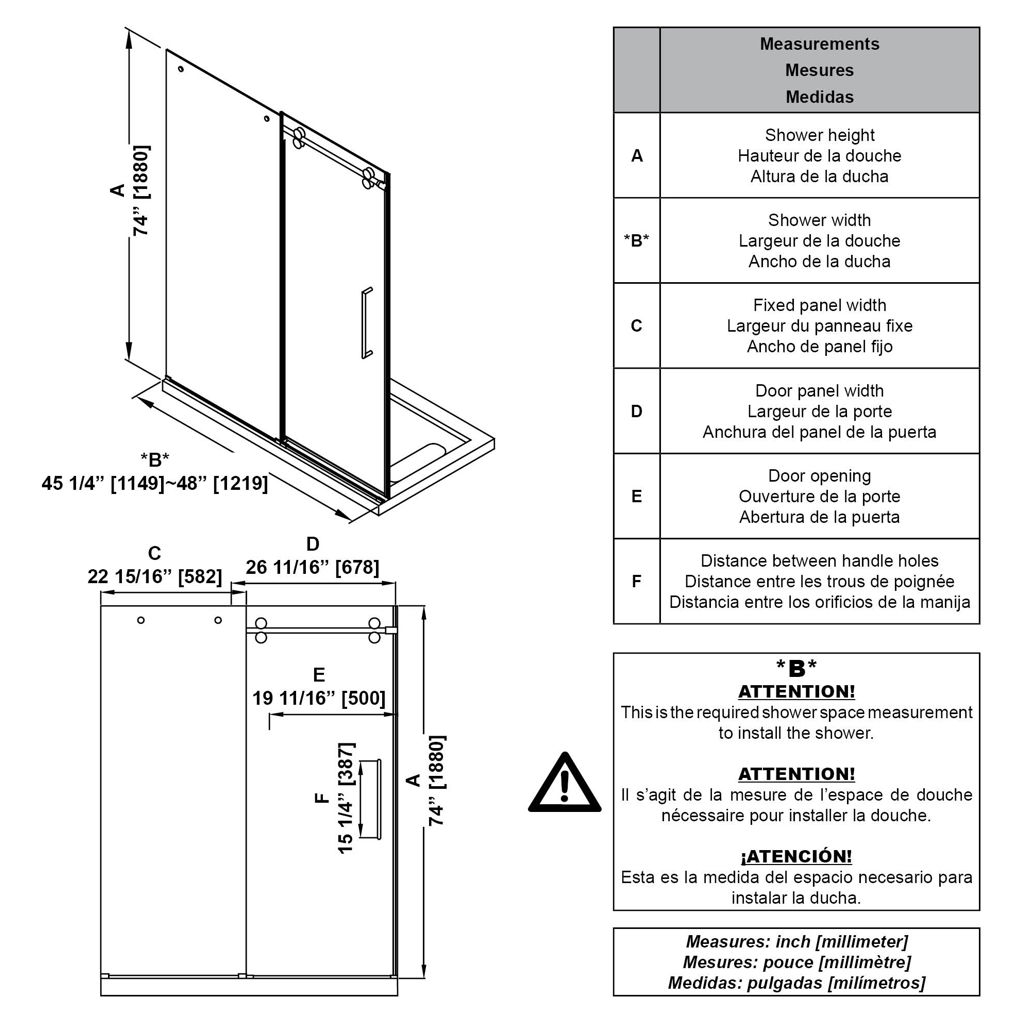 • Please refer to the PDF instruction manual for detailed product dimensions to ensure the shower door fits your bathroom layout