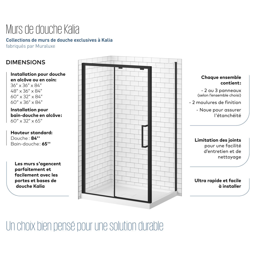 In addition to matching perfectly with the doors and bases of Kalia, Kalia shower wall panels are effortlessly stylish and come in a choice of contemporary and timeless looks including: classic ceramic tile, ultra-modern industrial, and contemporary-chic marble.