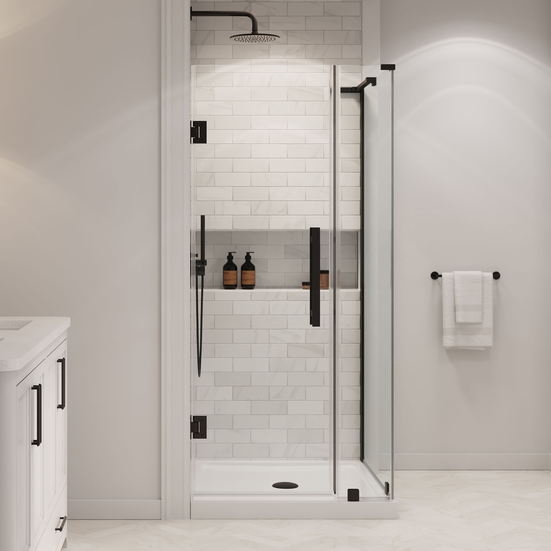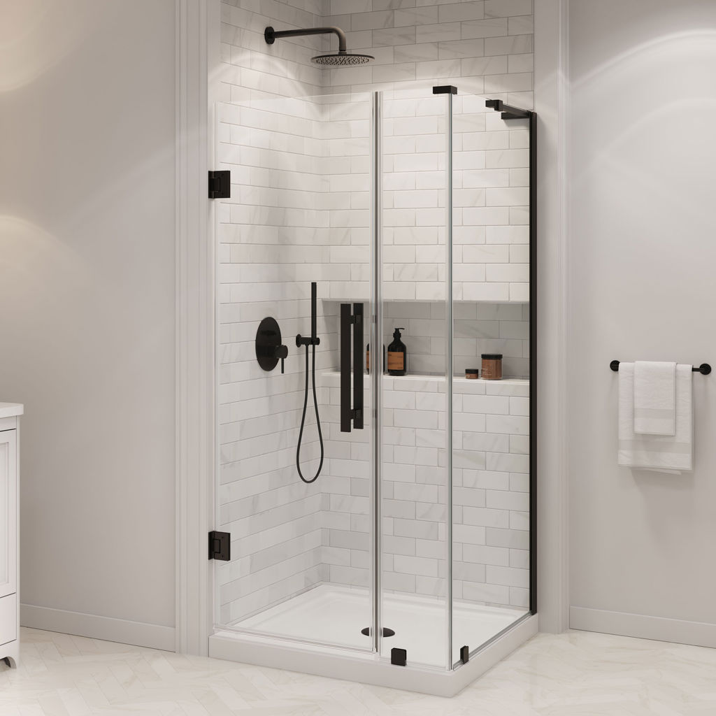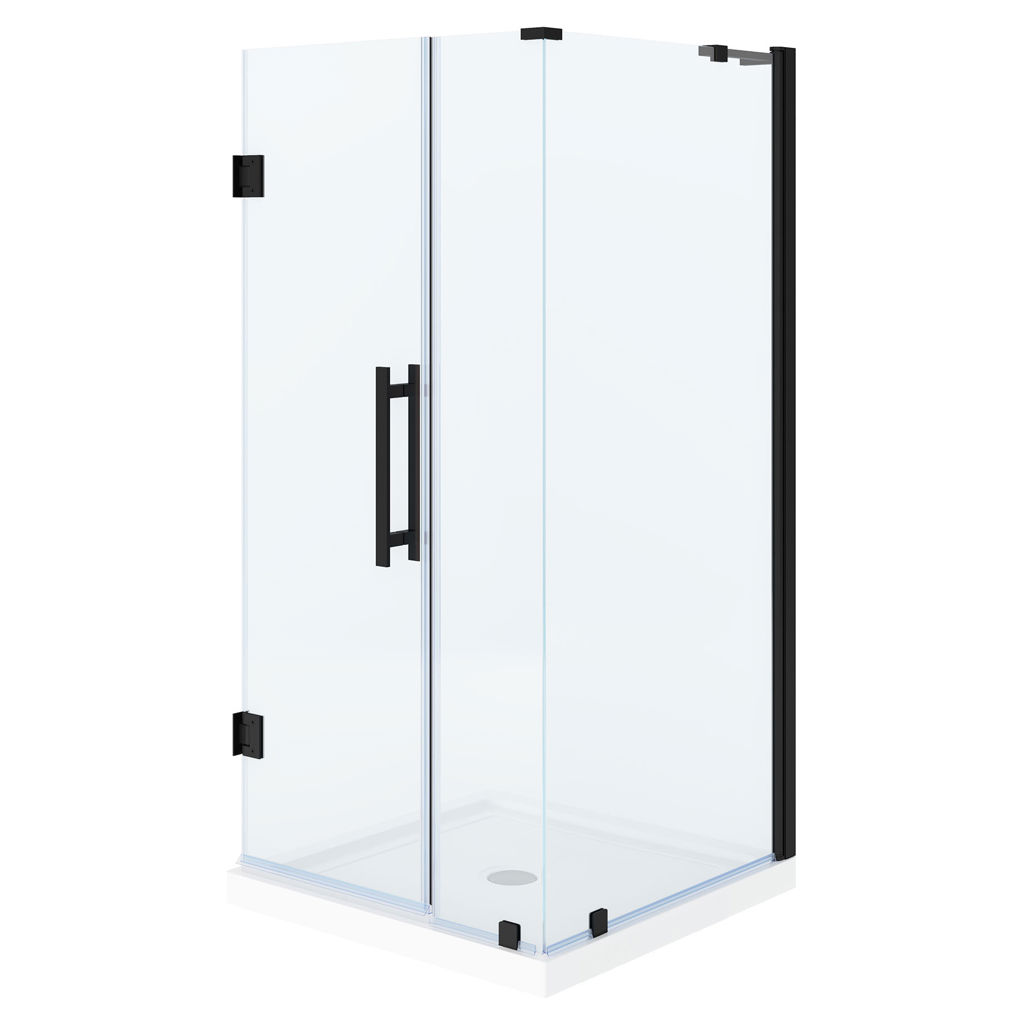 The set includes premium hardware with an elegant black  finish, a 23 in door panel, a 10 in fixed panel, and a 36 x 36 x 2.75 in shower base, ideal for a corner installation.