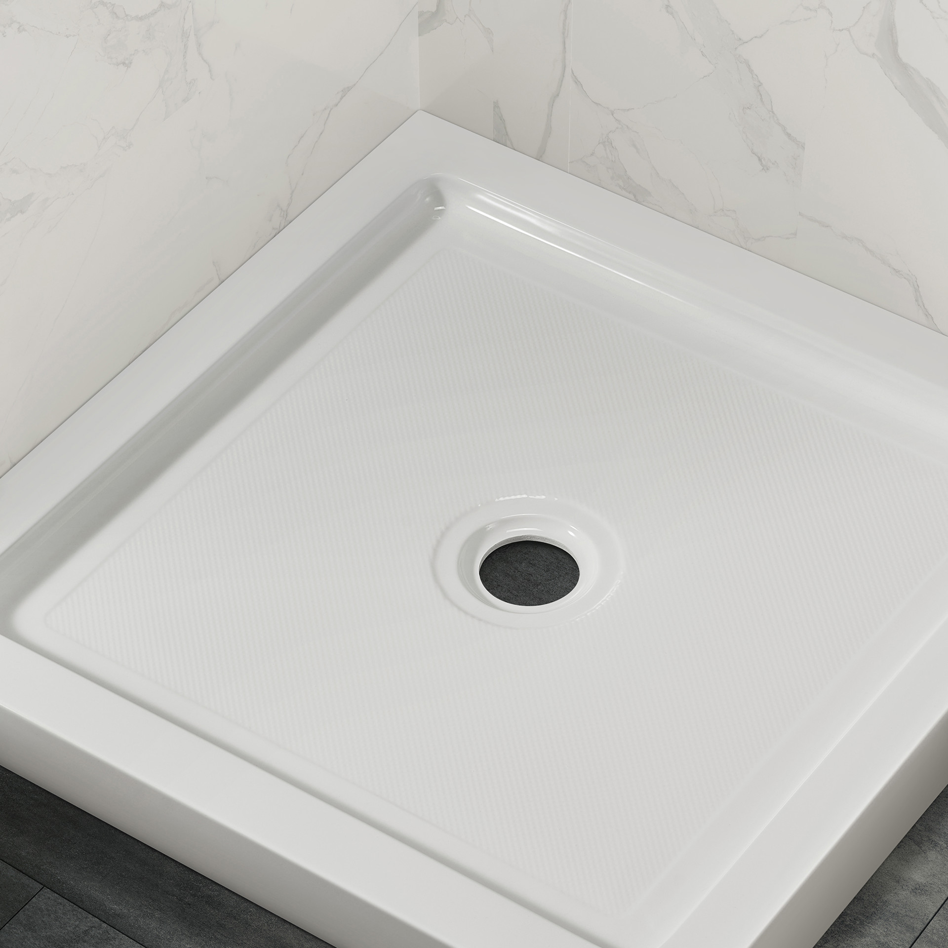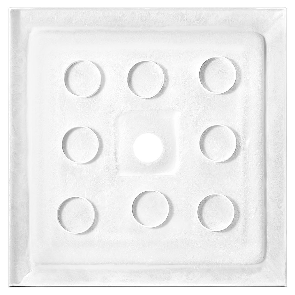 The center-drain base is made of fiberglass-reinforced acrylic with a textured, easy-to-clean, slip-resistant surface.