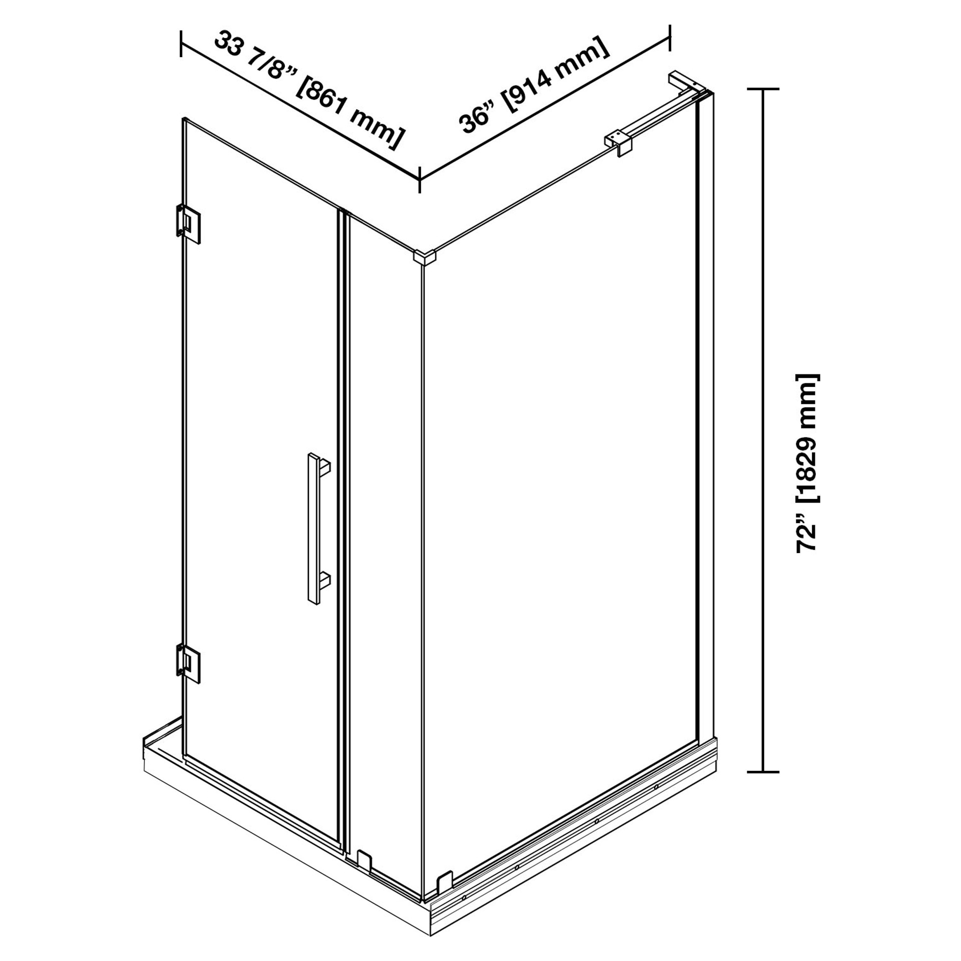 • Pivot shower set for alcove installation: 36 in W x 36 in D x 74 in H