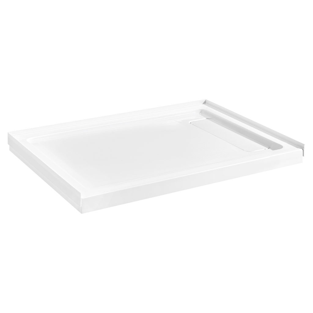 The reversible shower base includes a discreet side drain, is made of premium fiberglass-reinforced acrylic, and offers a textured, slip-resistant, easy-to-clean surface.