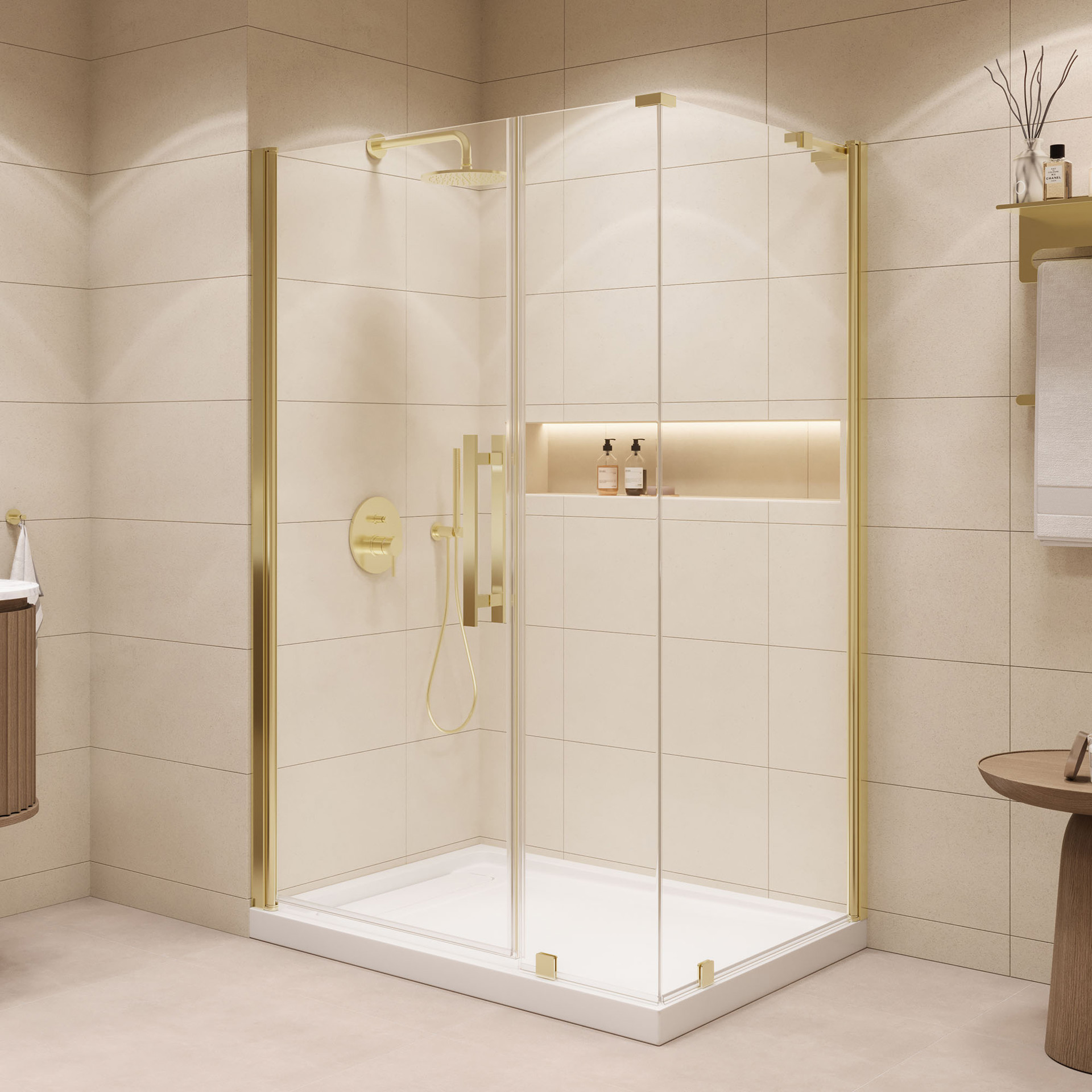 Pasadena Pivot Shower Door Set with Base 48x36 in. for Corner Installation - Brushed Gold