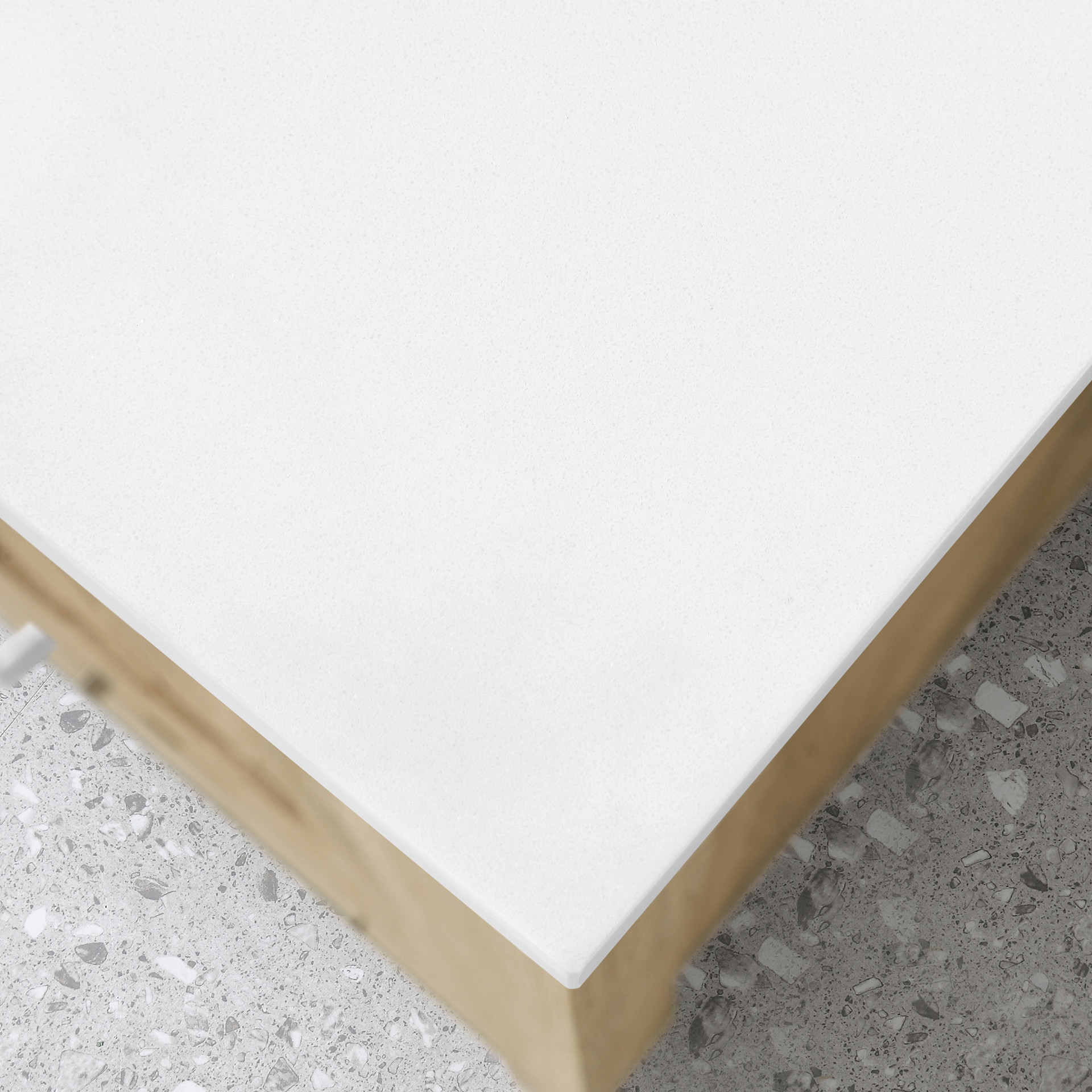 Its one-piece ceramic countertop with an integrated sink is designed to maximize use of the compact surface area.