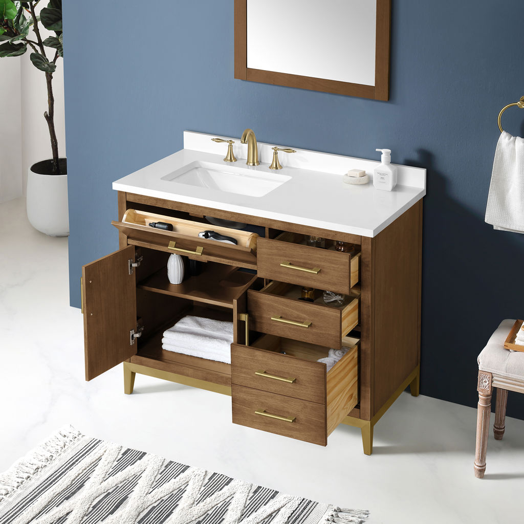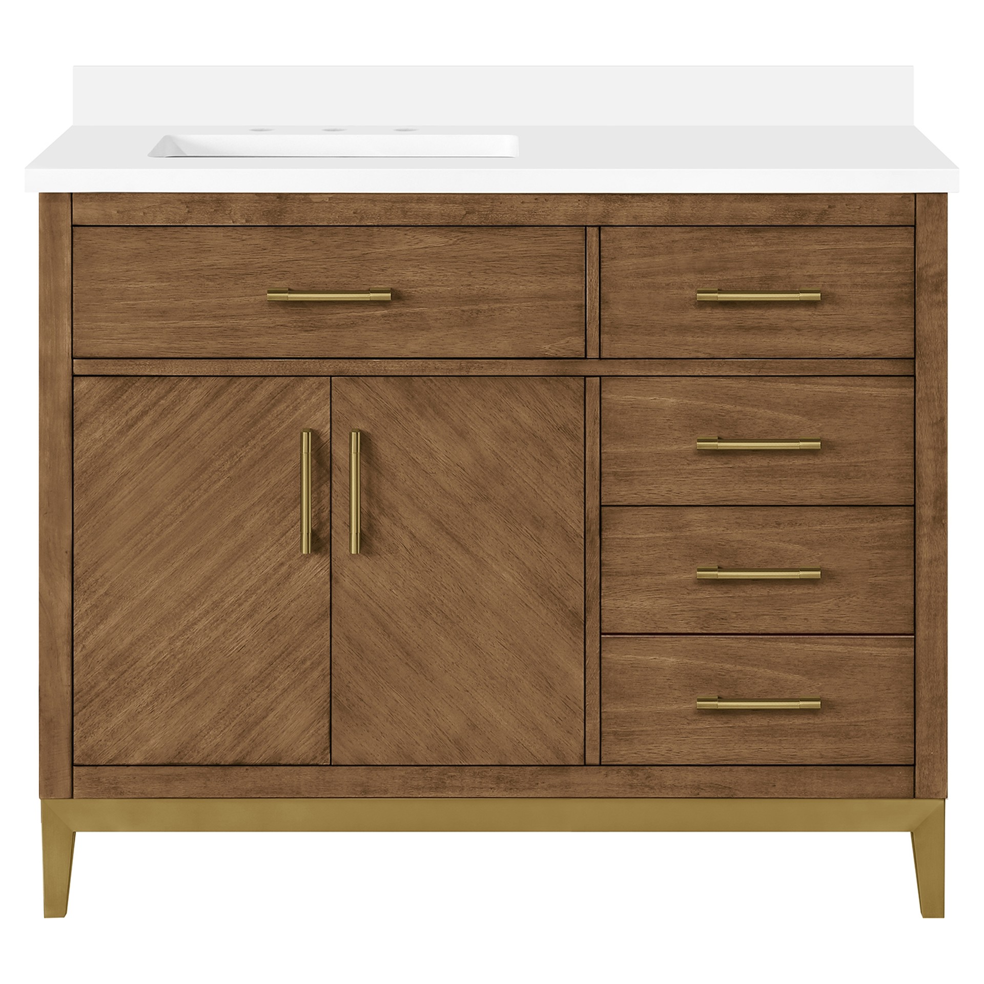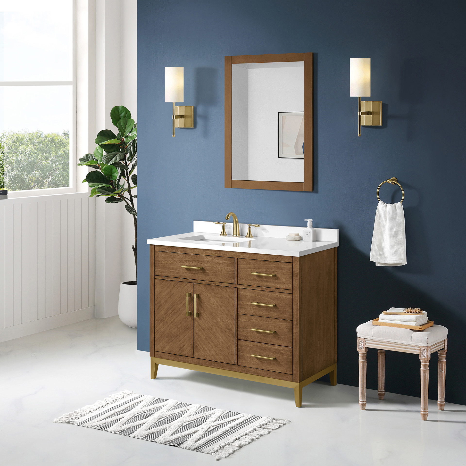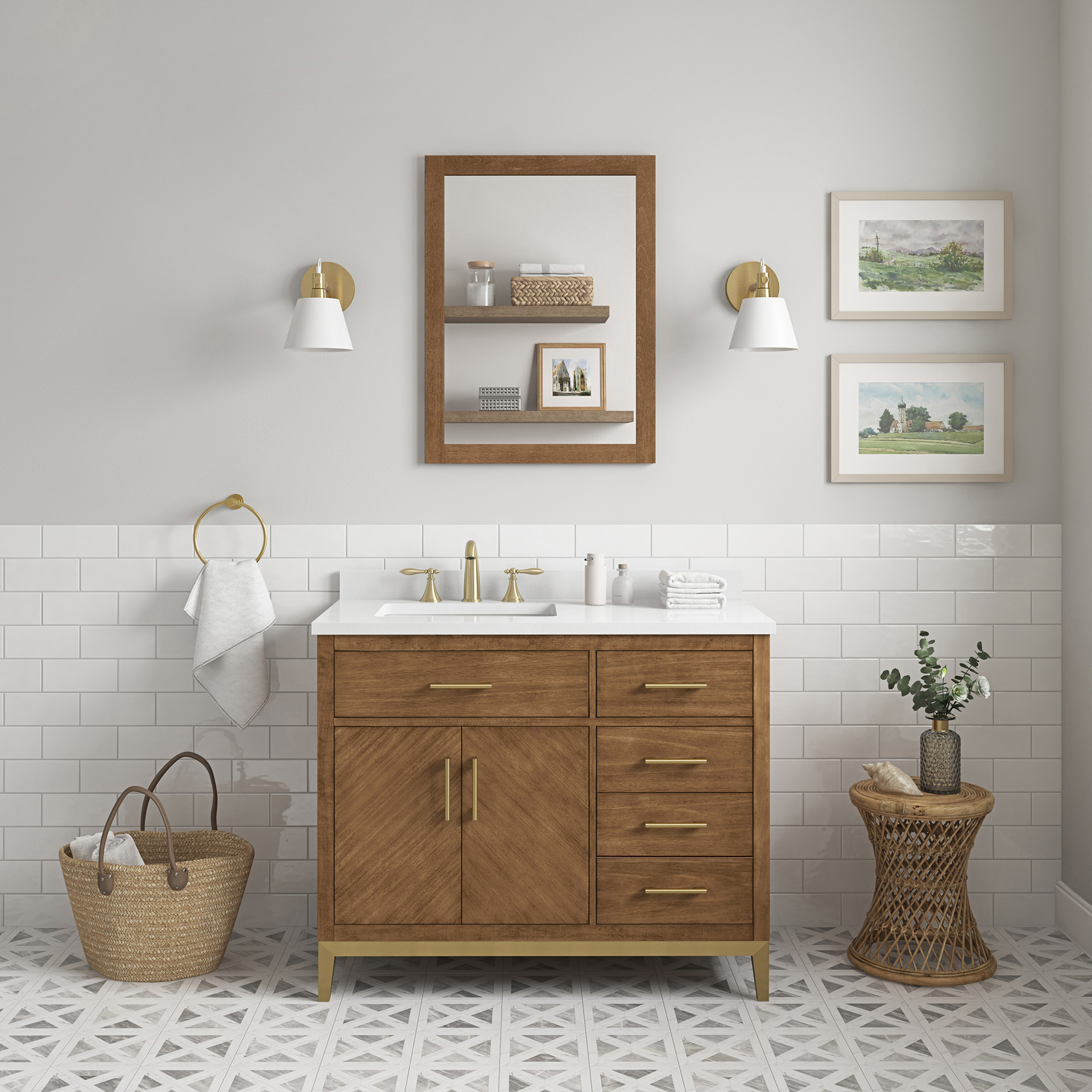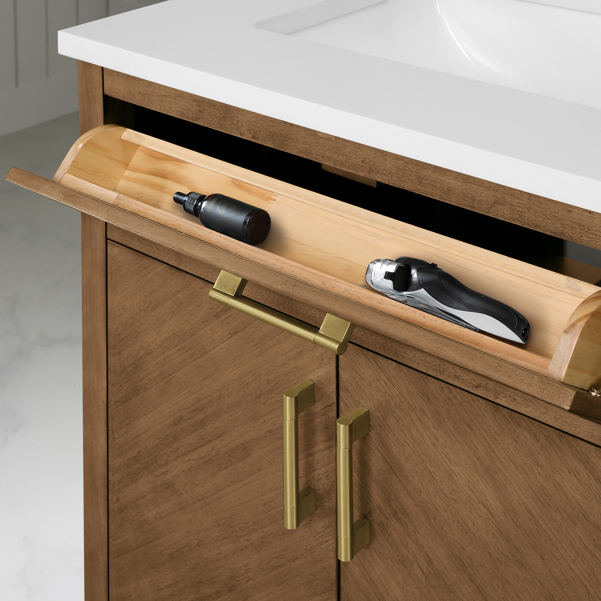 With its soothing macchiato finish and beautiful brushed gold accents, this vanity strikes the perfect balance between modern trend and timeless elegance.