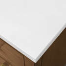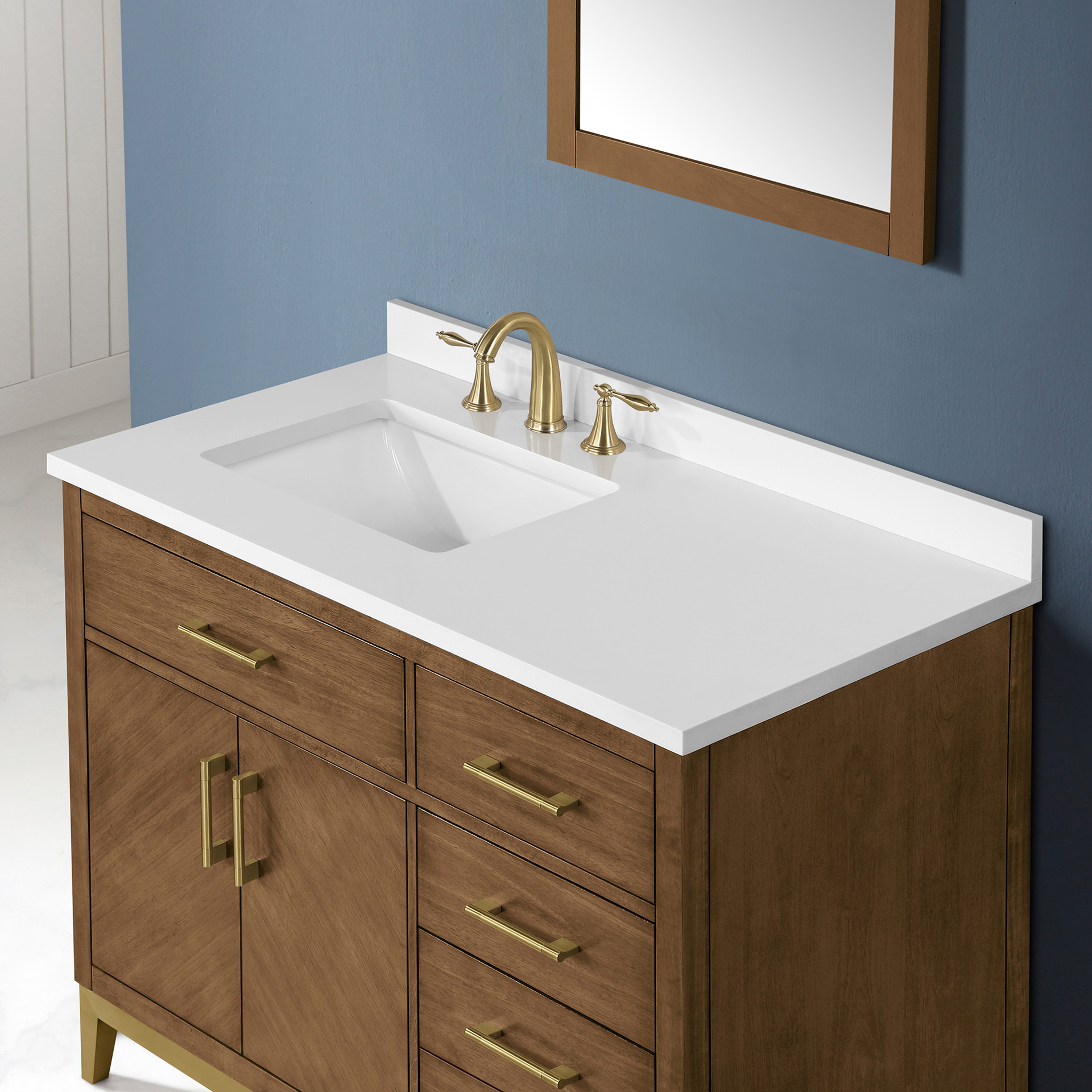 The white engineered stone countertop features a sleek undermount sink that complements the vanity’s clean, contemporary design.