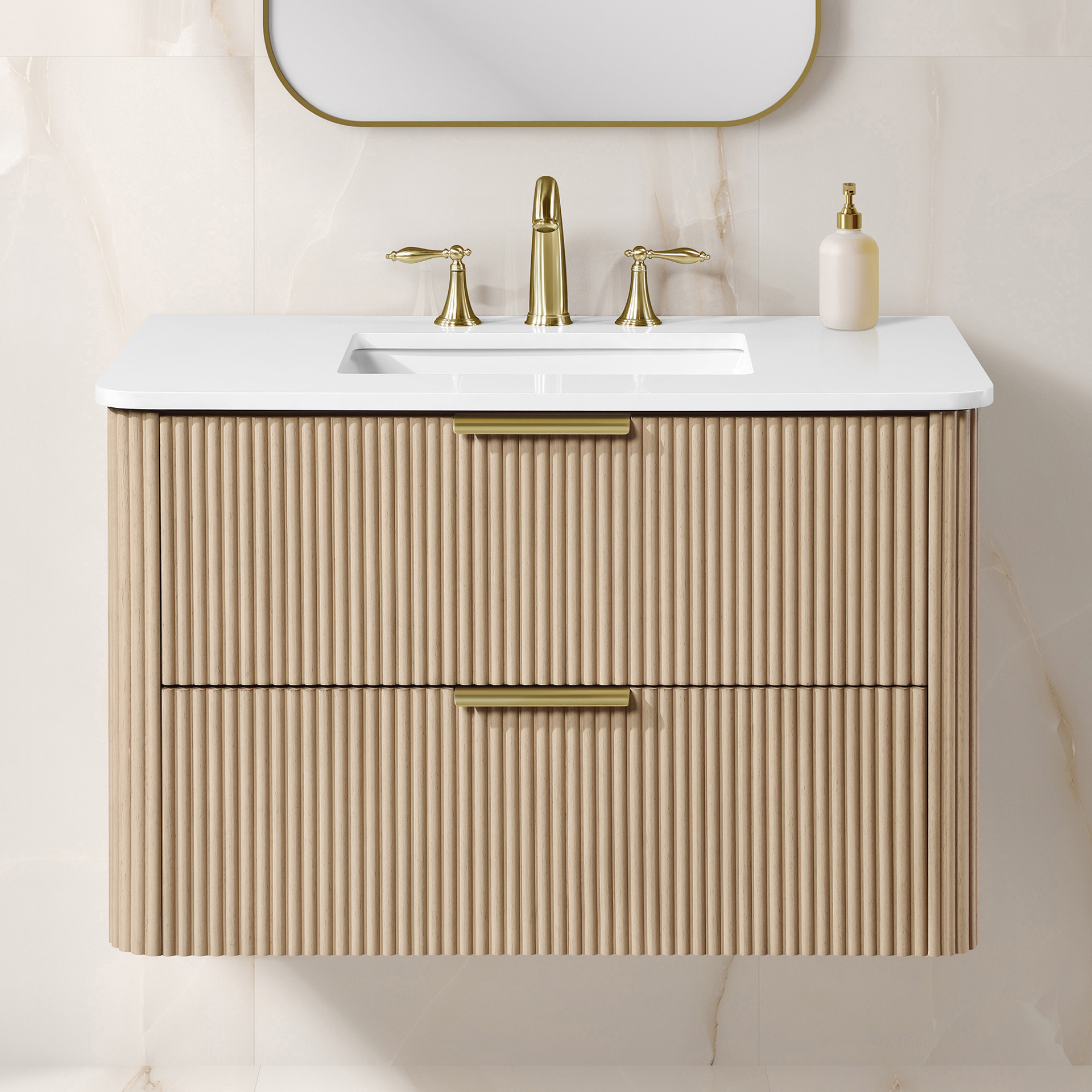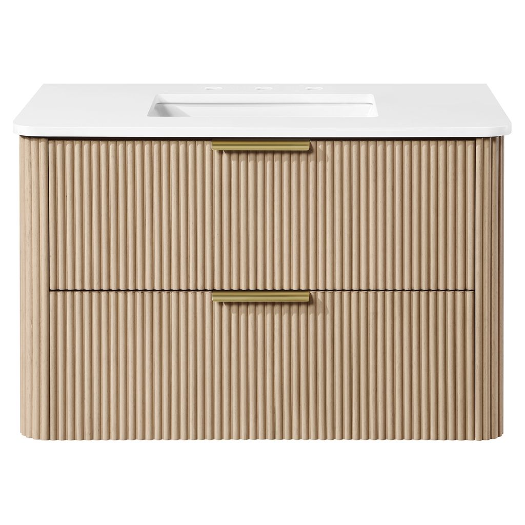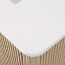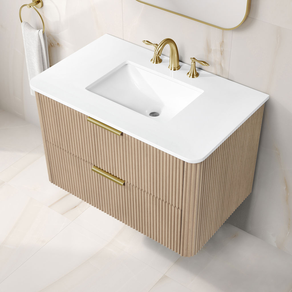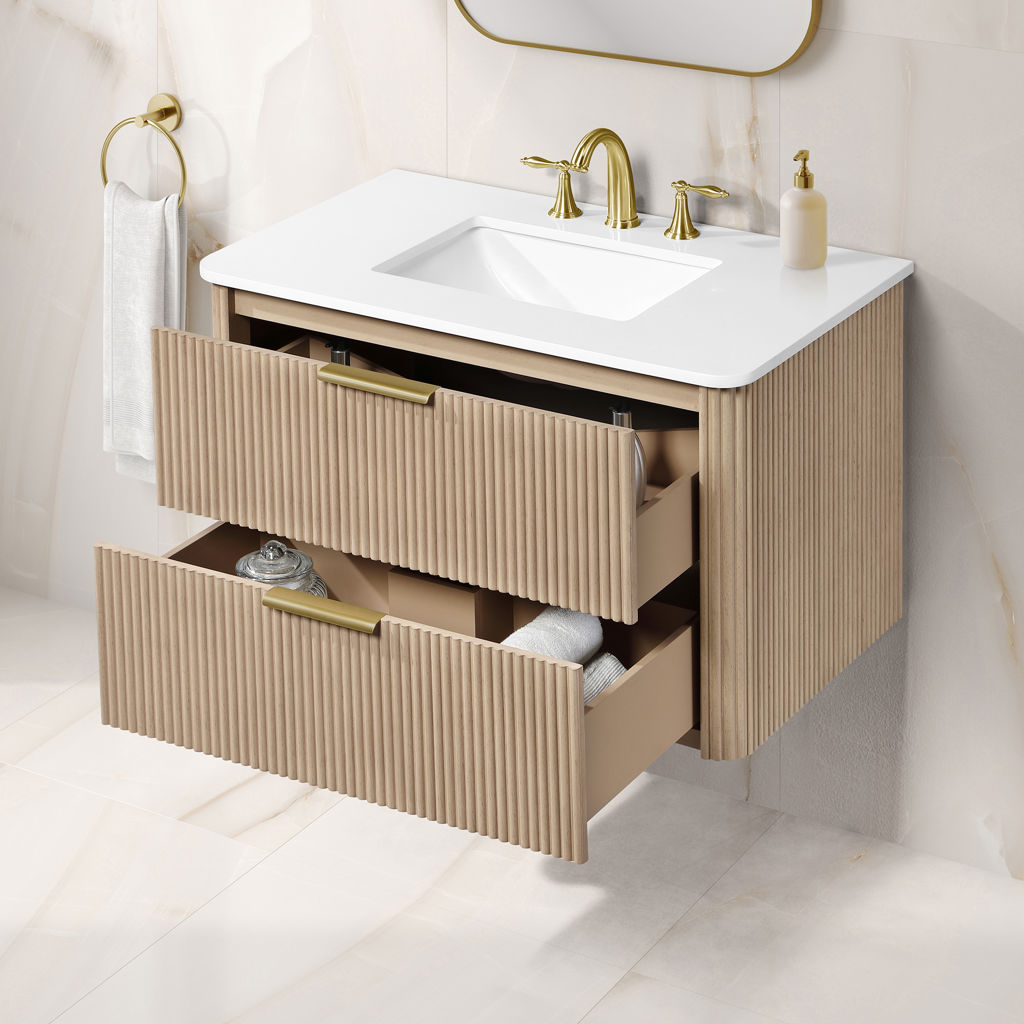With its timeless fluted detailing, Sahara Birch finish, and on-trend rounded corners on both the cabinet and countertop, it adds the perfect touch of elegance to contemporary spaces.