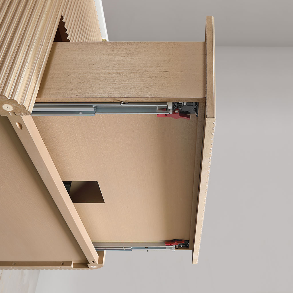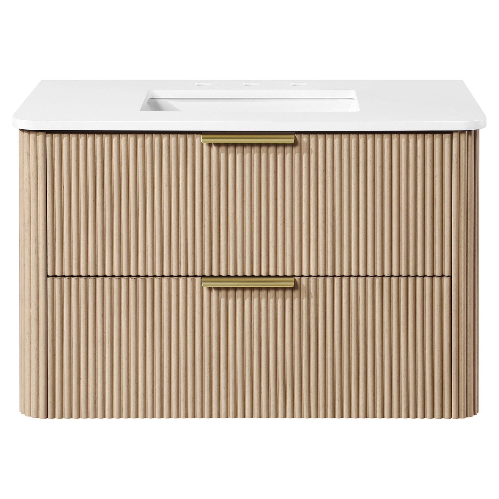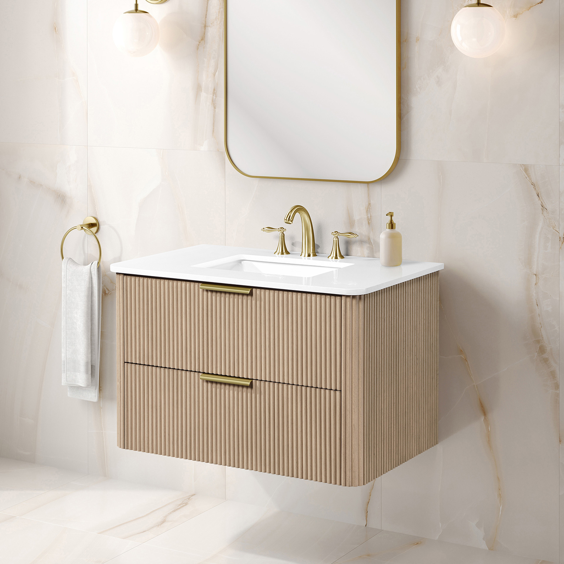 With its timeless fluted detailing, Sahara Birch finish, and on-trend rounded corners on both the cabinet and countertop, it adds the perfect touch of elegance to contemporary spaces.