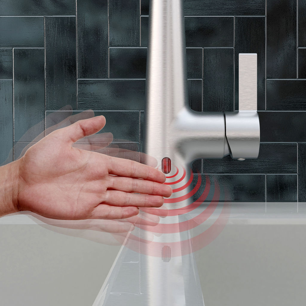 • Laser sensor (2.5” range - 6.5 cm) activates/deactivates water jet with hand movement