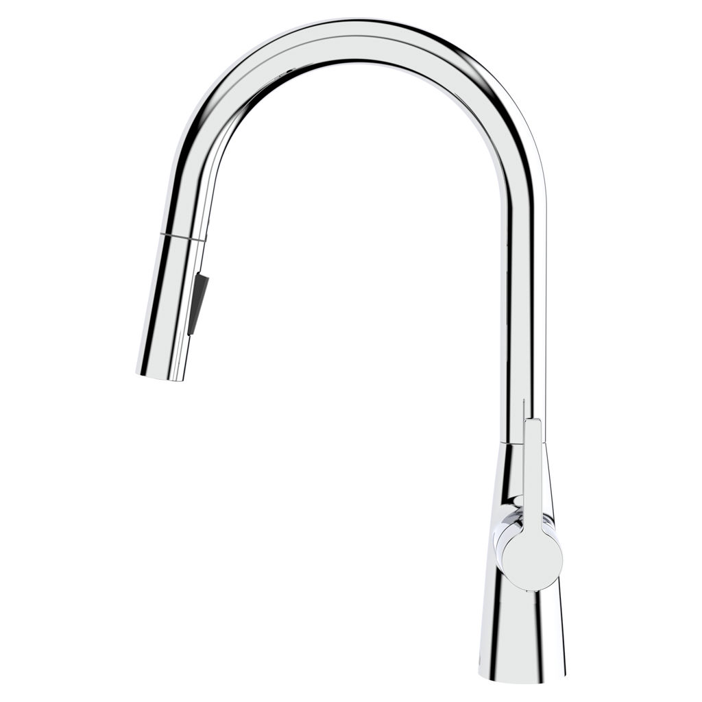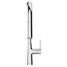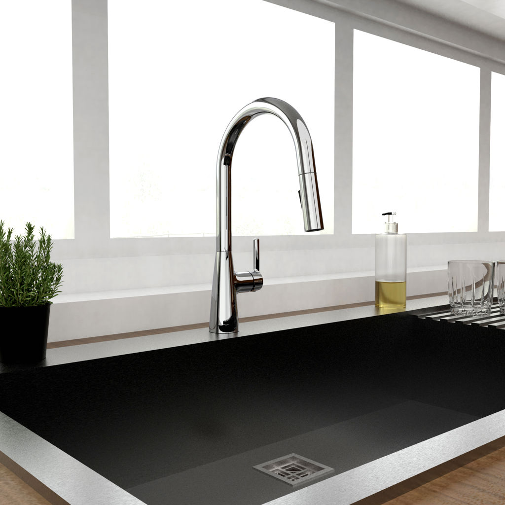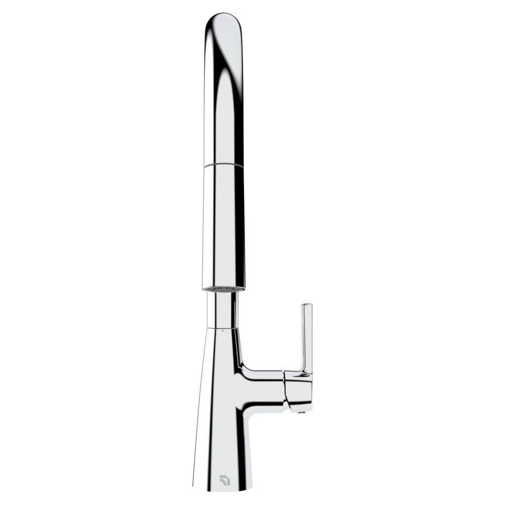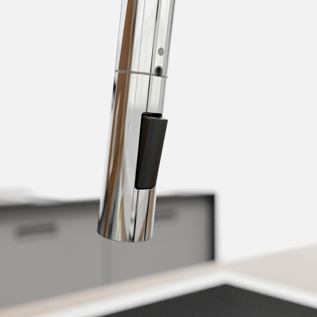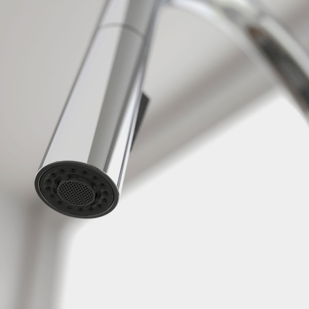 Swivel pull-down spout with push-button diverter (stream and spray jets) and 59 braided nylon flexible hose.