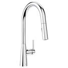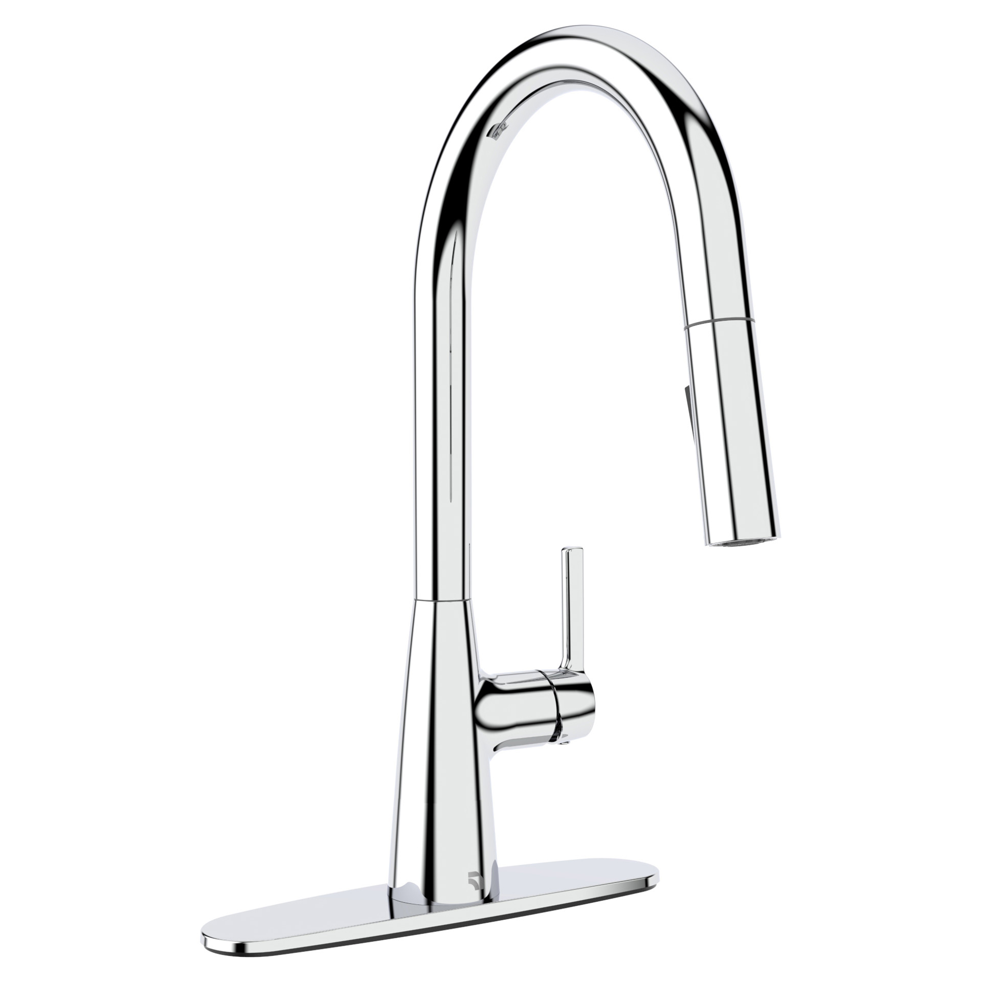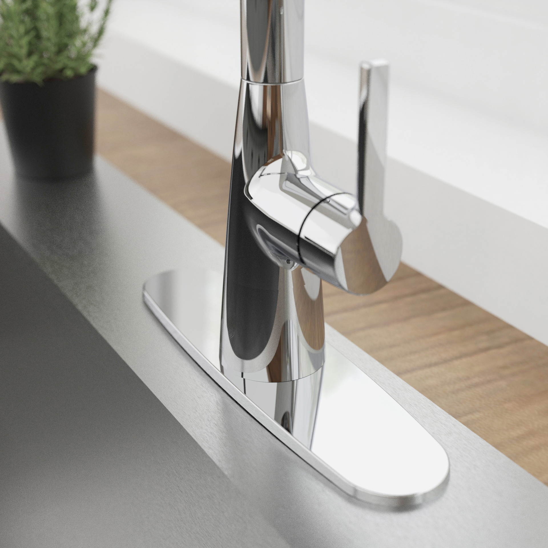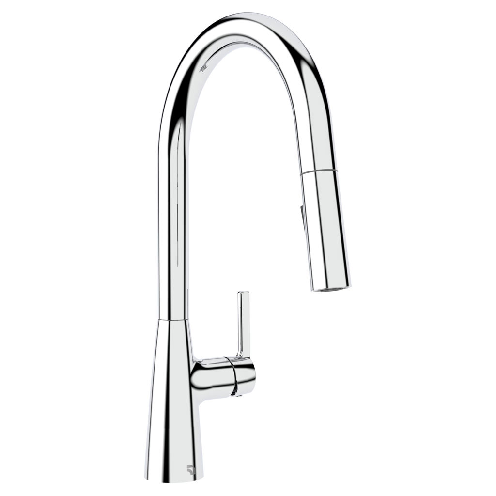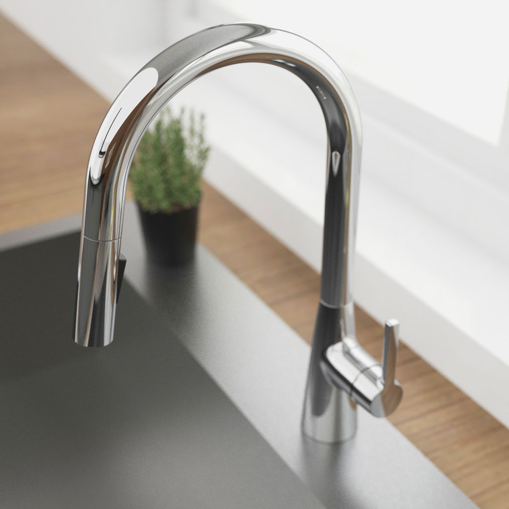 Swivel pull-down spout with push-button diverter (stream and spray jets) and 59 braided nylon flexible hose.