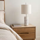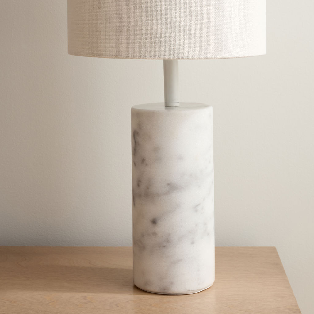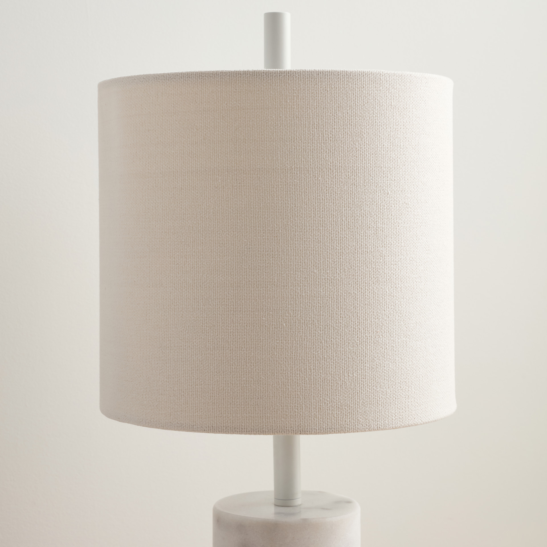 This table lamp celebrates the harmonious blend of white veined marble and natural fabric in a clean, soothing design. The cylindrical marble base reveals the subtle variations of the stone, bringing an accessible touch of luxury to your space.