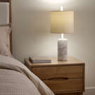 The genuine marble not only offers unique visual beauty with its delicate veining, but also reassuring stability. The light-colored cylindrical fabric shade diffuses a soft, even glow that creates a warm and welcoming atmosphere, perfect for moments of relaxation.