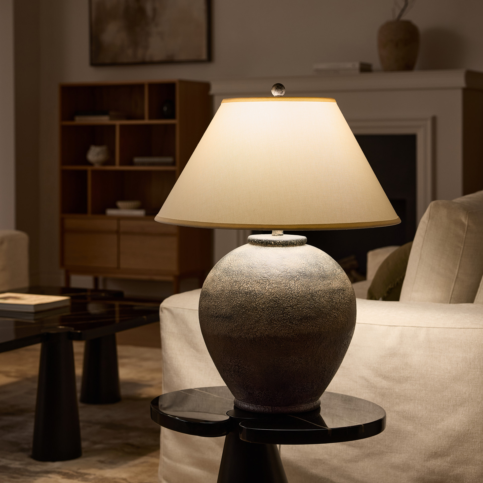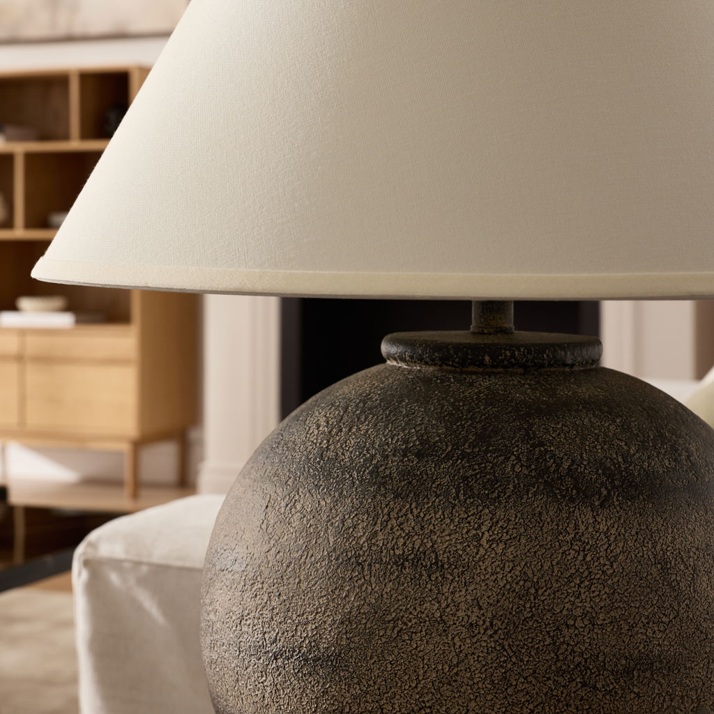The textured base table lamp brings a warm touch to your home. Designed with style in mind, it features a richly textured body in dark brown and beige tones, brass-plated accents, and a tapered ivory linen shade.