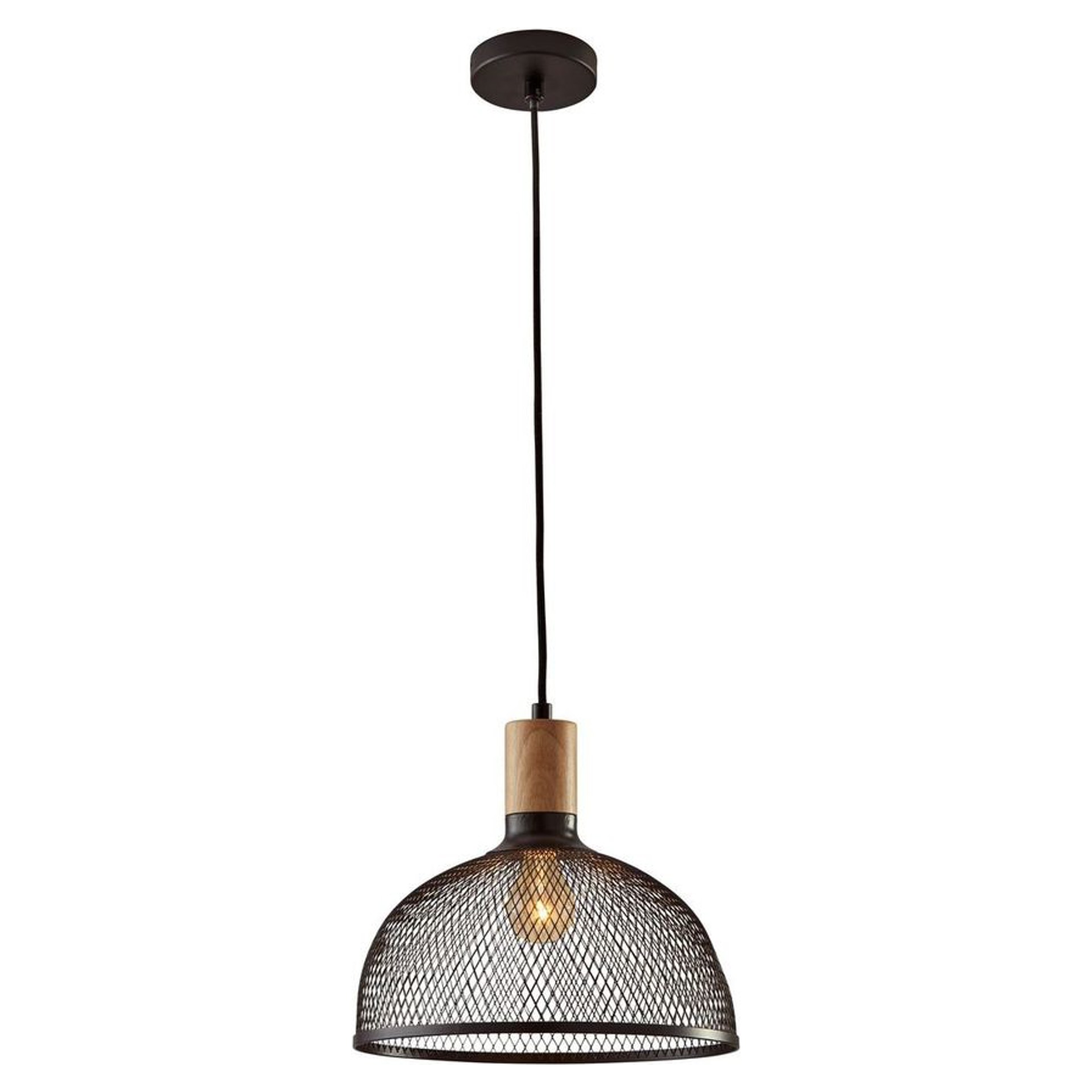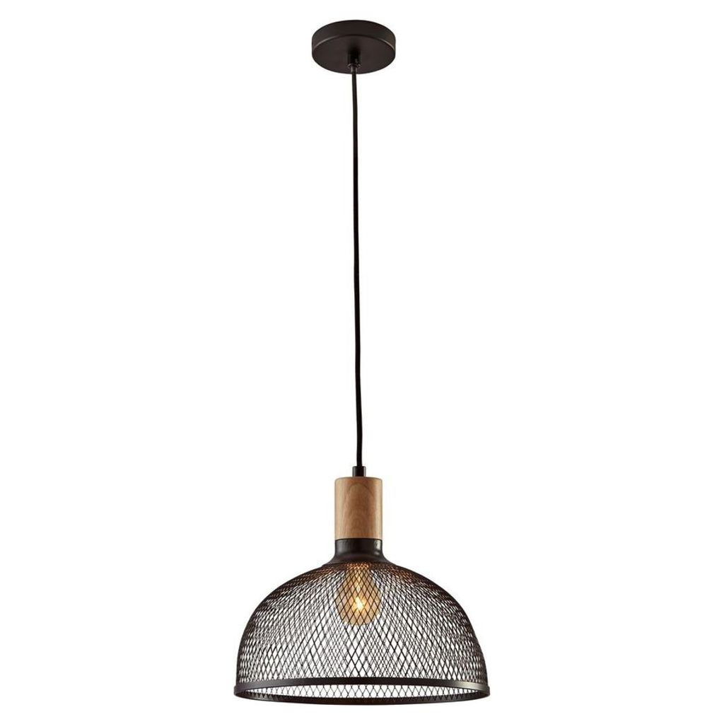 Add warmth and texture with this pendant light and its captivating handcrafted design. Its open black mesh shade creates a fascinating play of shadows, enhanced by a natural wood accent that brings an organic touch.