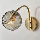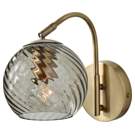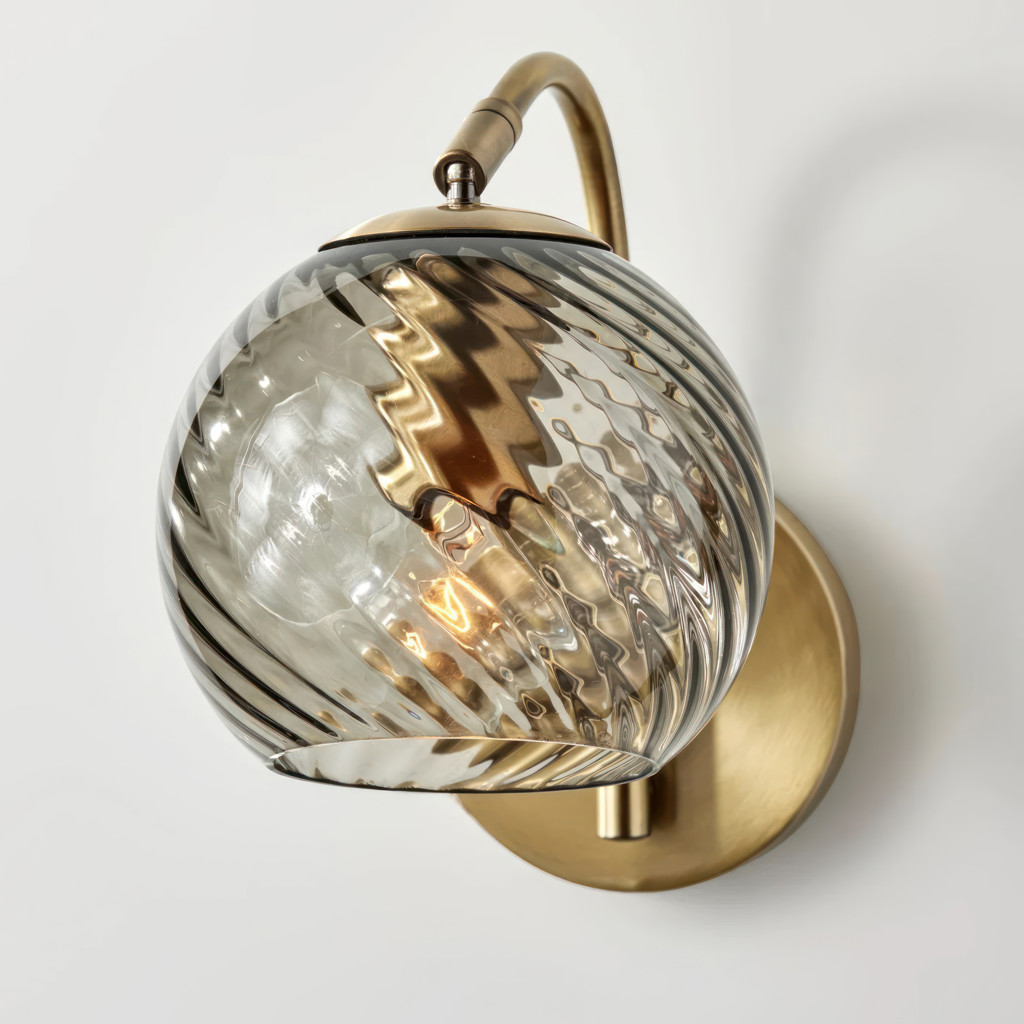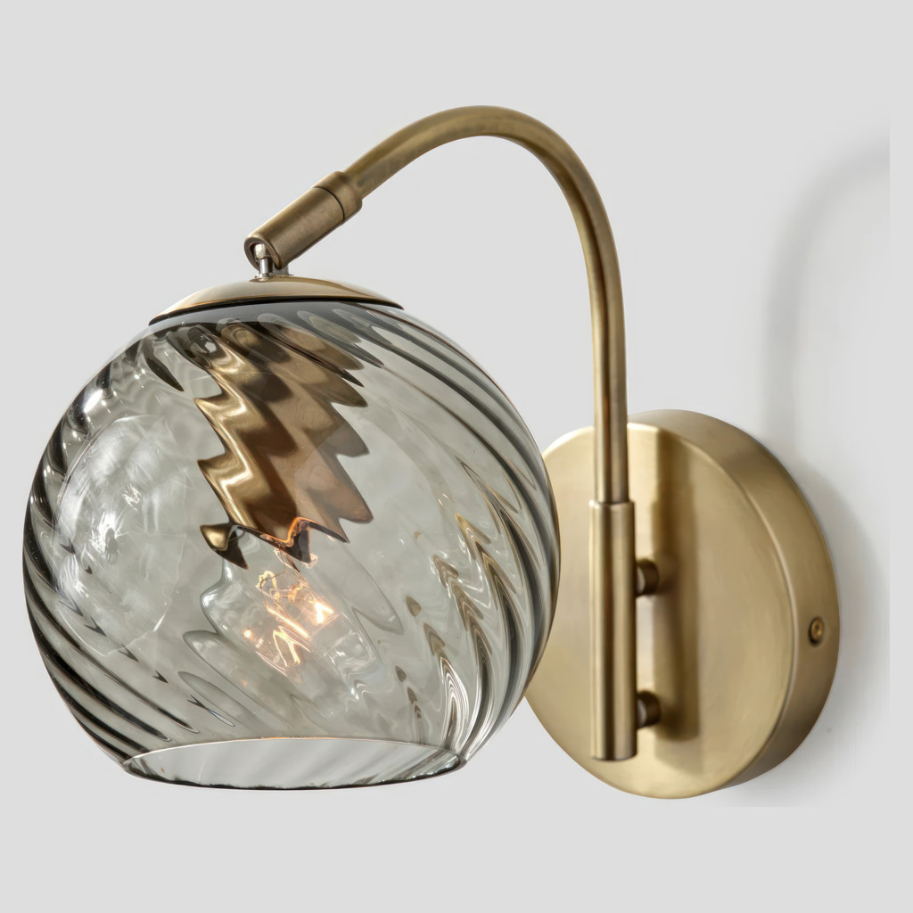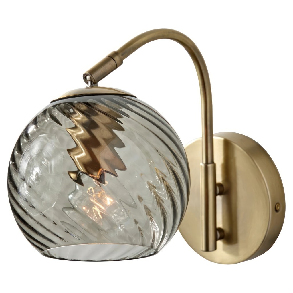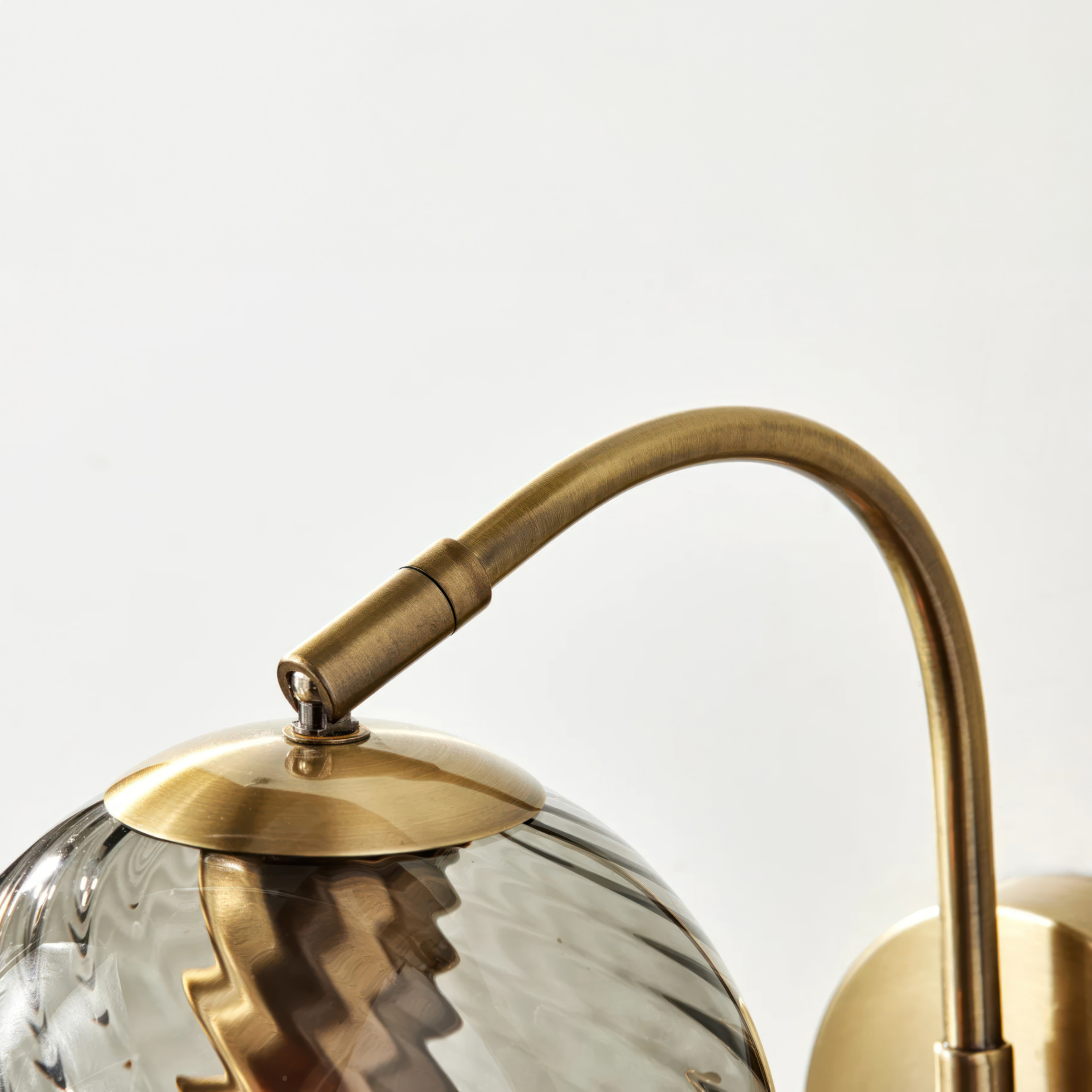 A round base with an antique brass finish supports a matching gently arcing stem. Suspended from the stem is a 6.5" diameter globe shade crafted of smoked glass with a delicate swirl pattern.