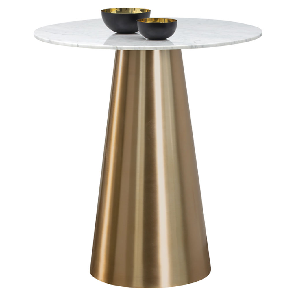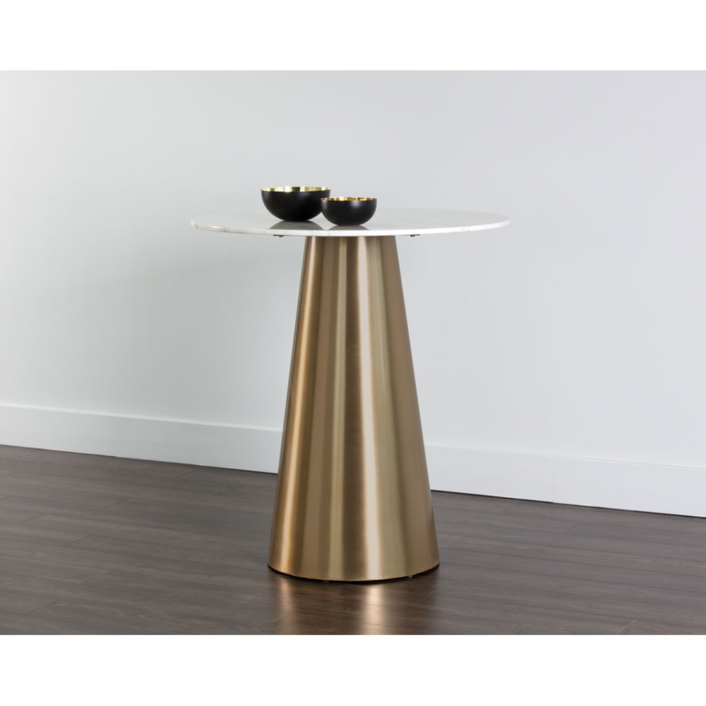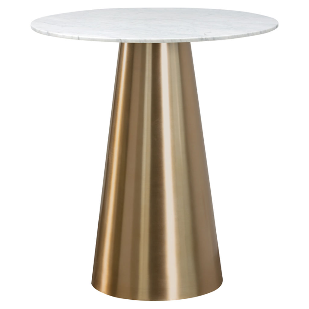 An absolutely gorgeous tapered bar table from our Ikon collection. Crafted with a brushed gold finish and a stunning marble top to enhance any contemporary dining or living room space. Suitable for both residential and commercial environments.