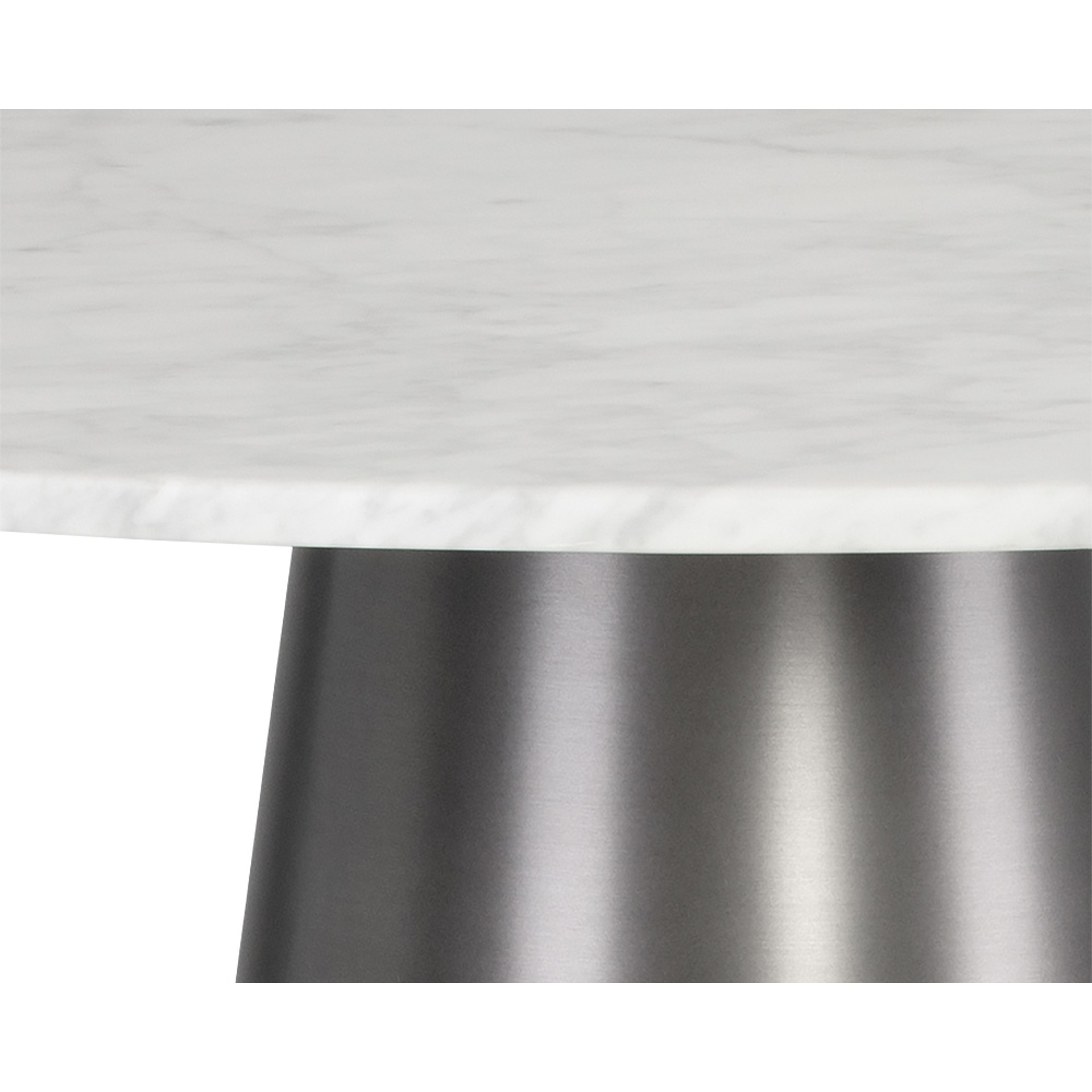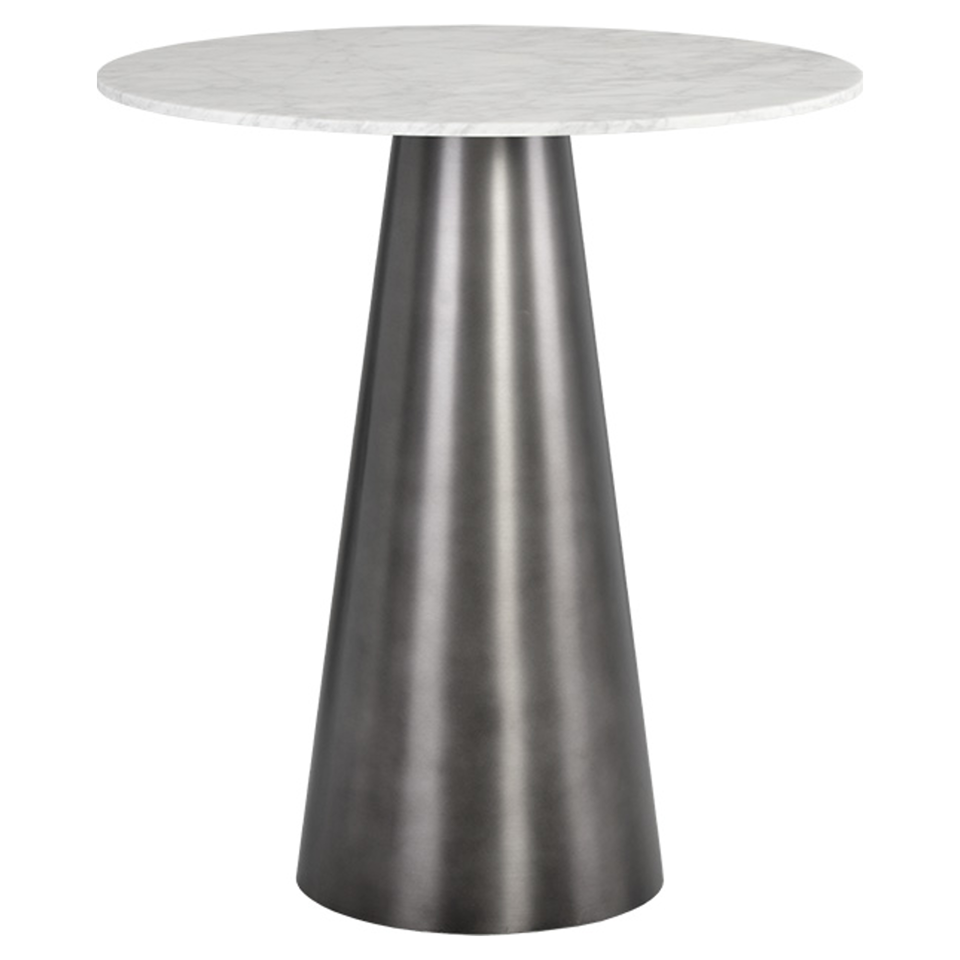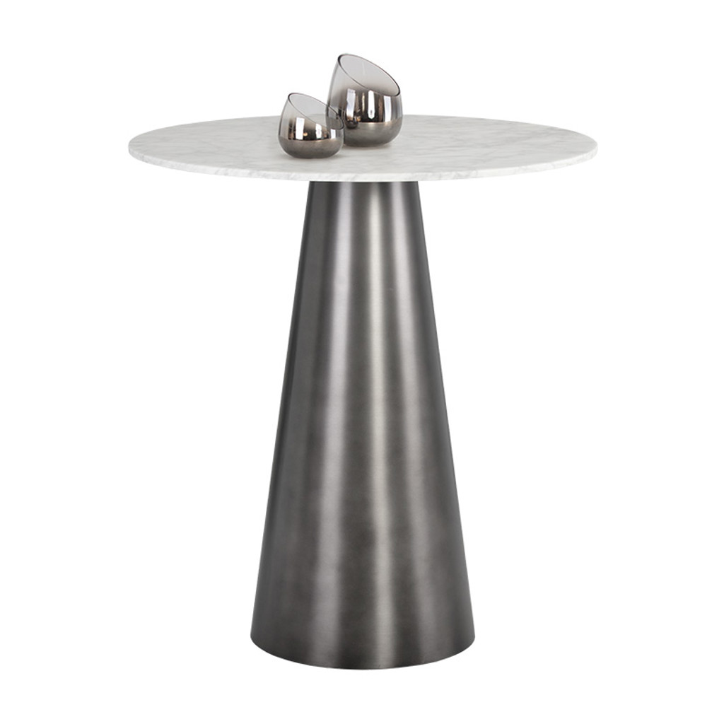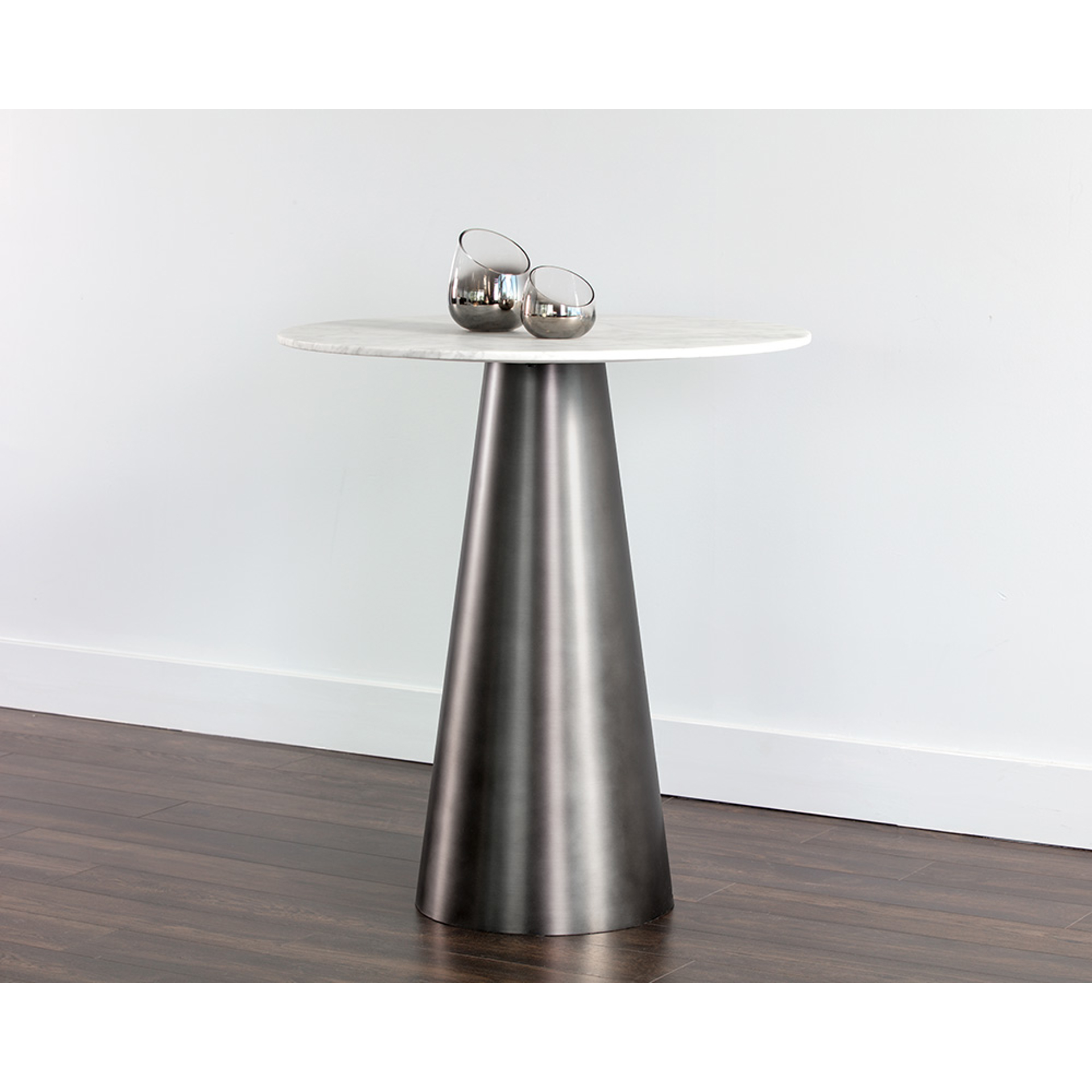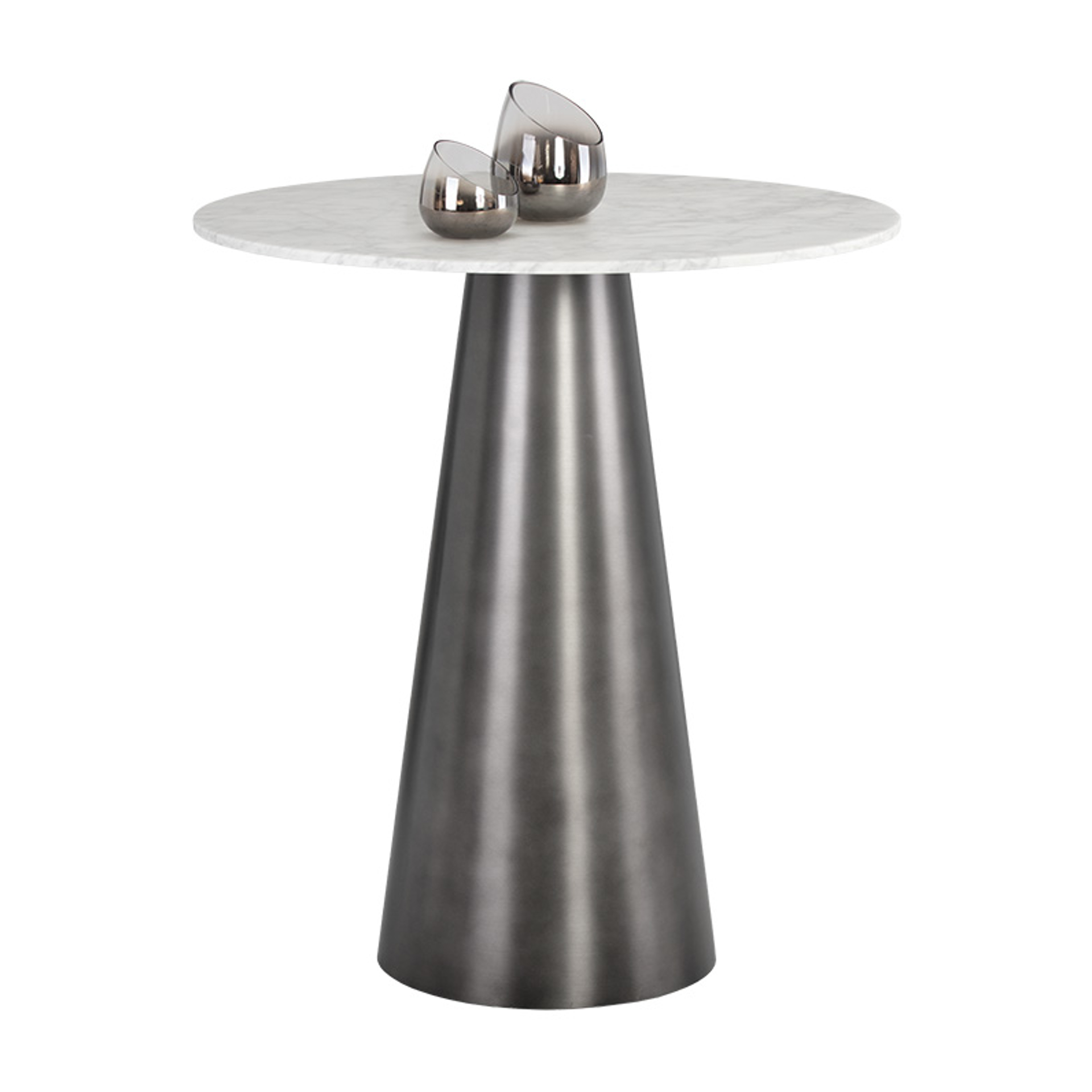 An absolutely stunning tapered bar table. Crafted with a brushed gunmetal base and a stunning white marble top to elevate any contemporary dining or lounge space. Suitable for residential and commercial environments.