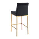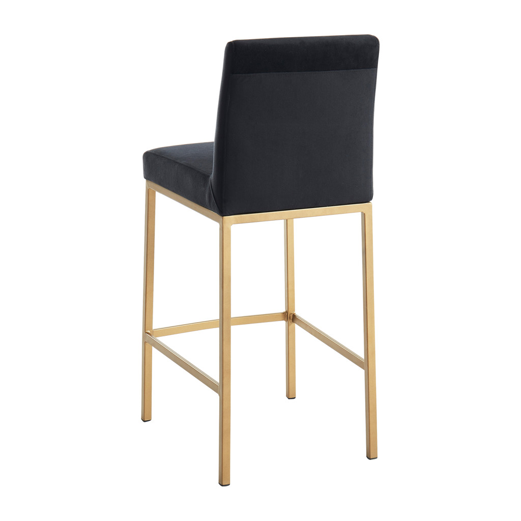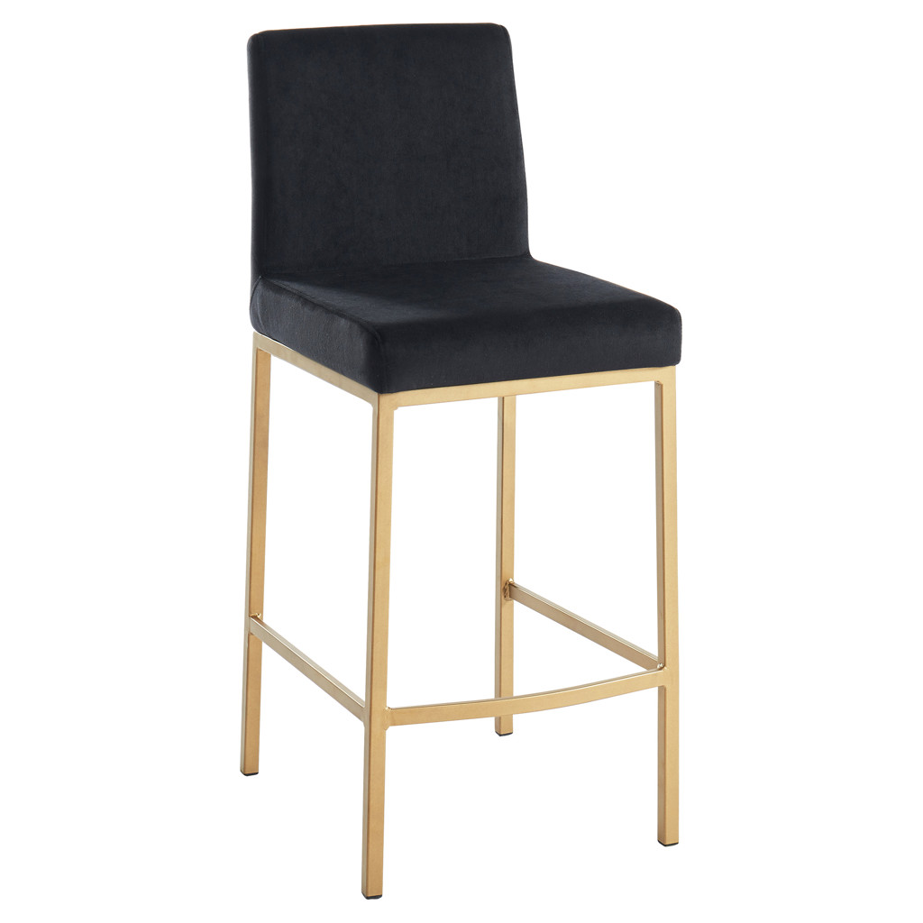 Contemporary counter height stool with a rich-looking combination of velvet upholstered seat and matte aged gold stool frame.