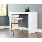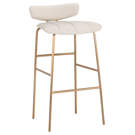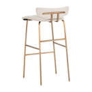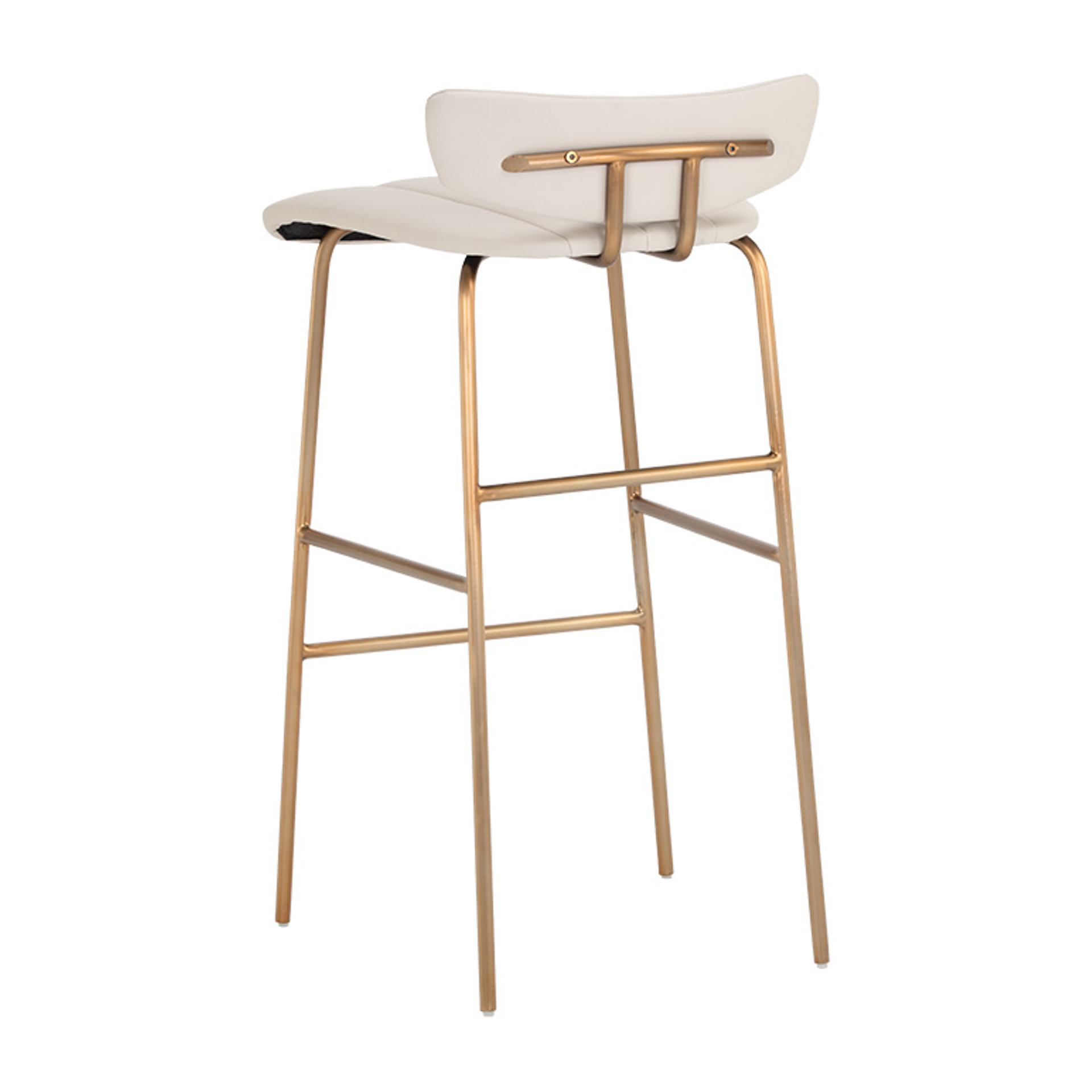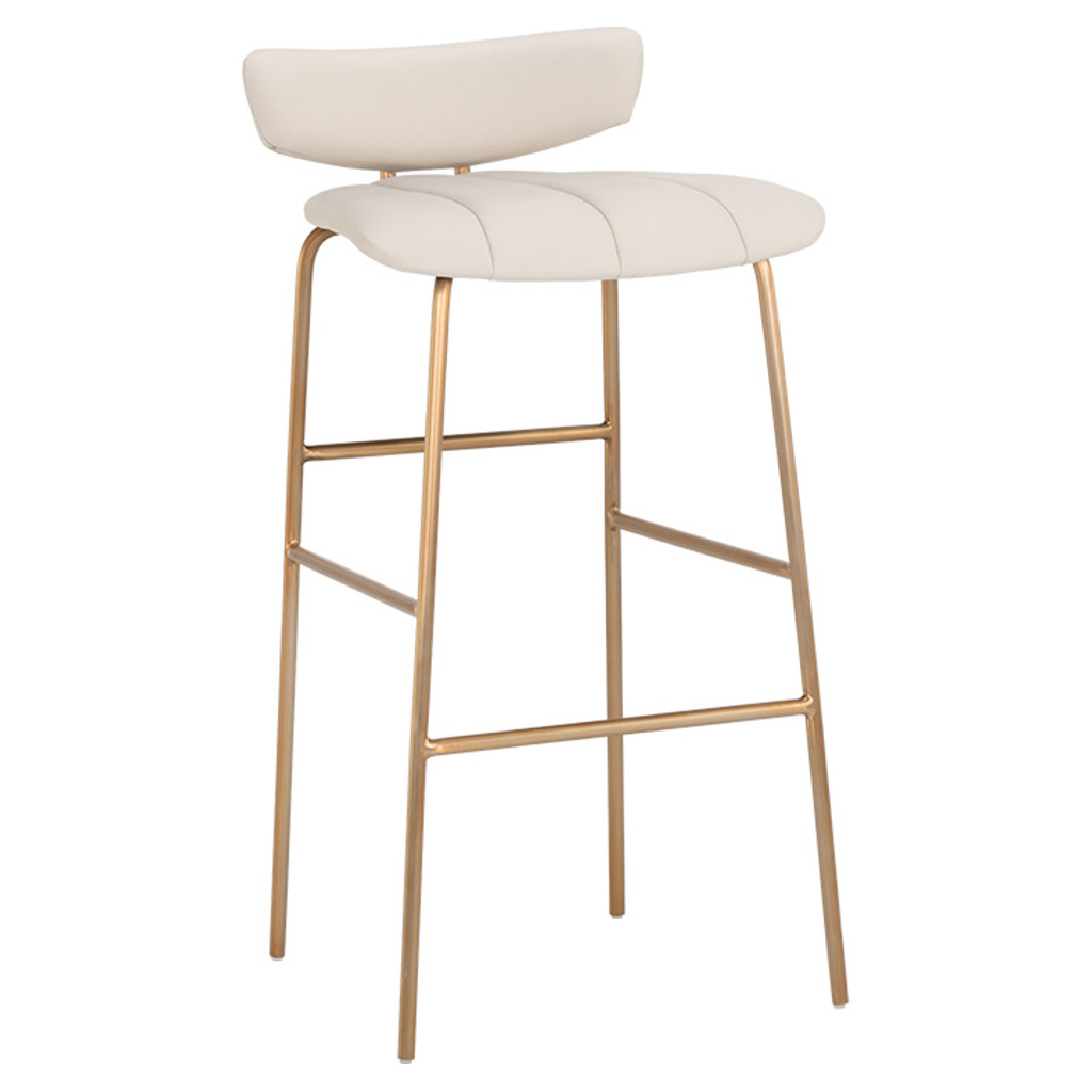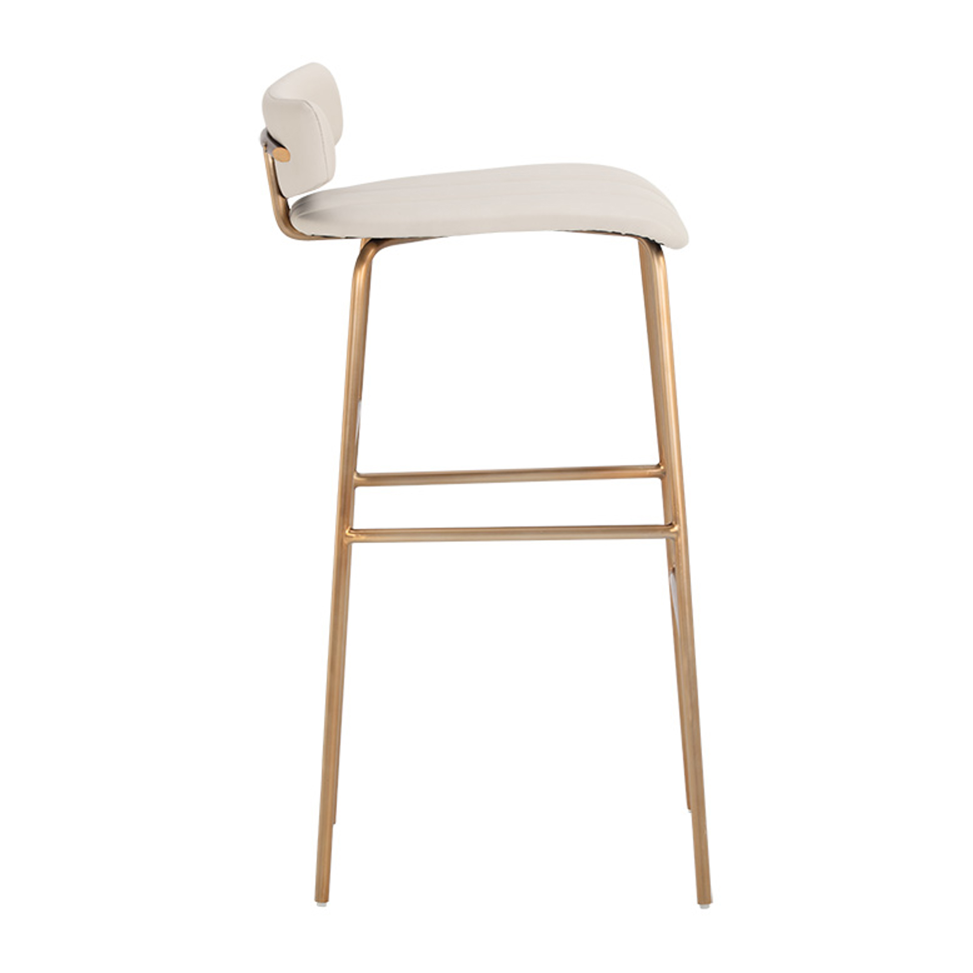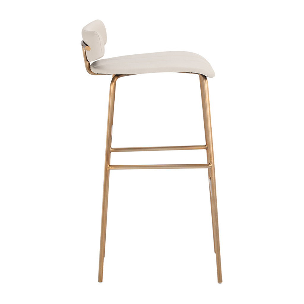 A truly chic and contemporary bar stool from our Ikon collection. Features an upholstered seat and low-profile faux leather seat back. A brushed gold stainless steel frame completes the look.